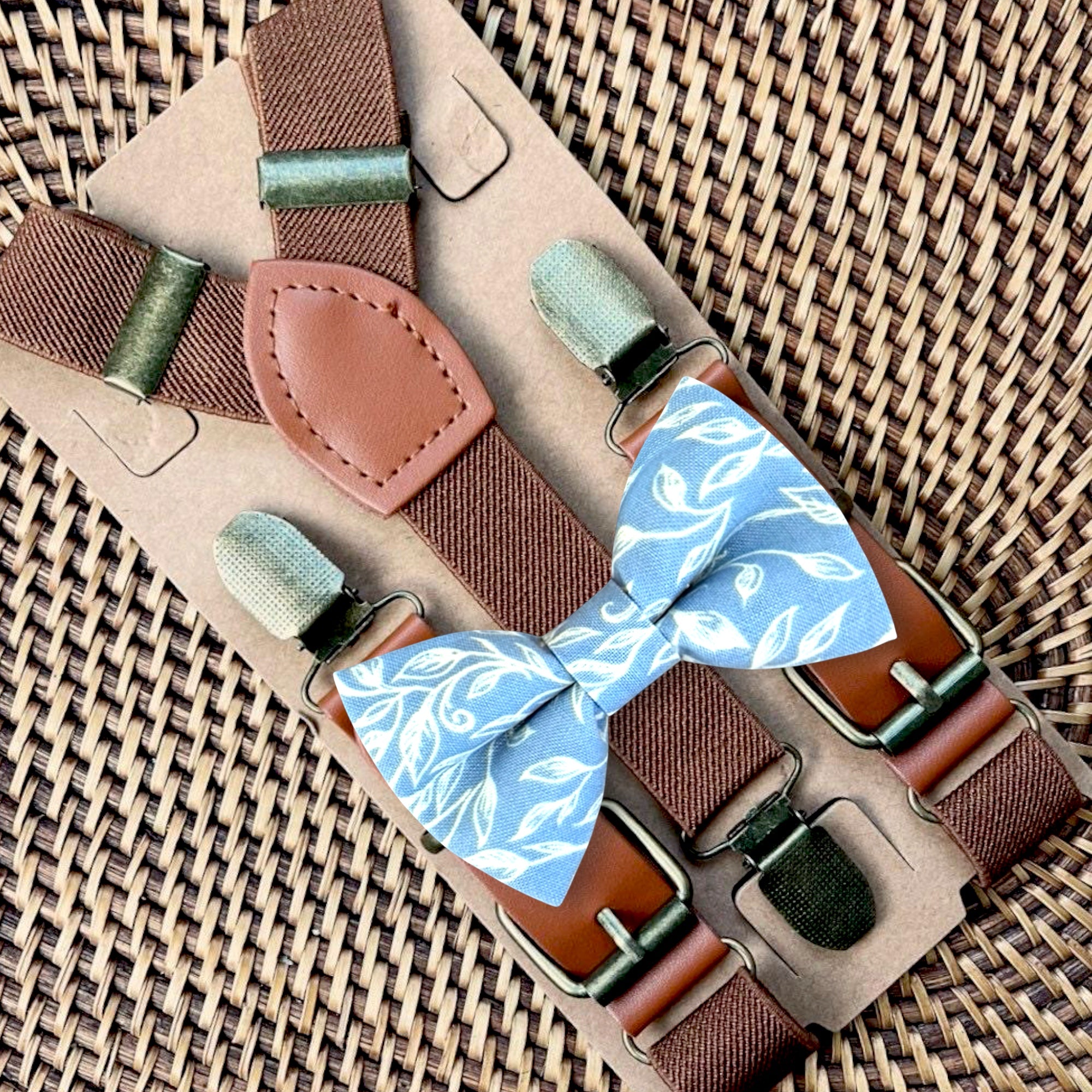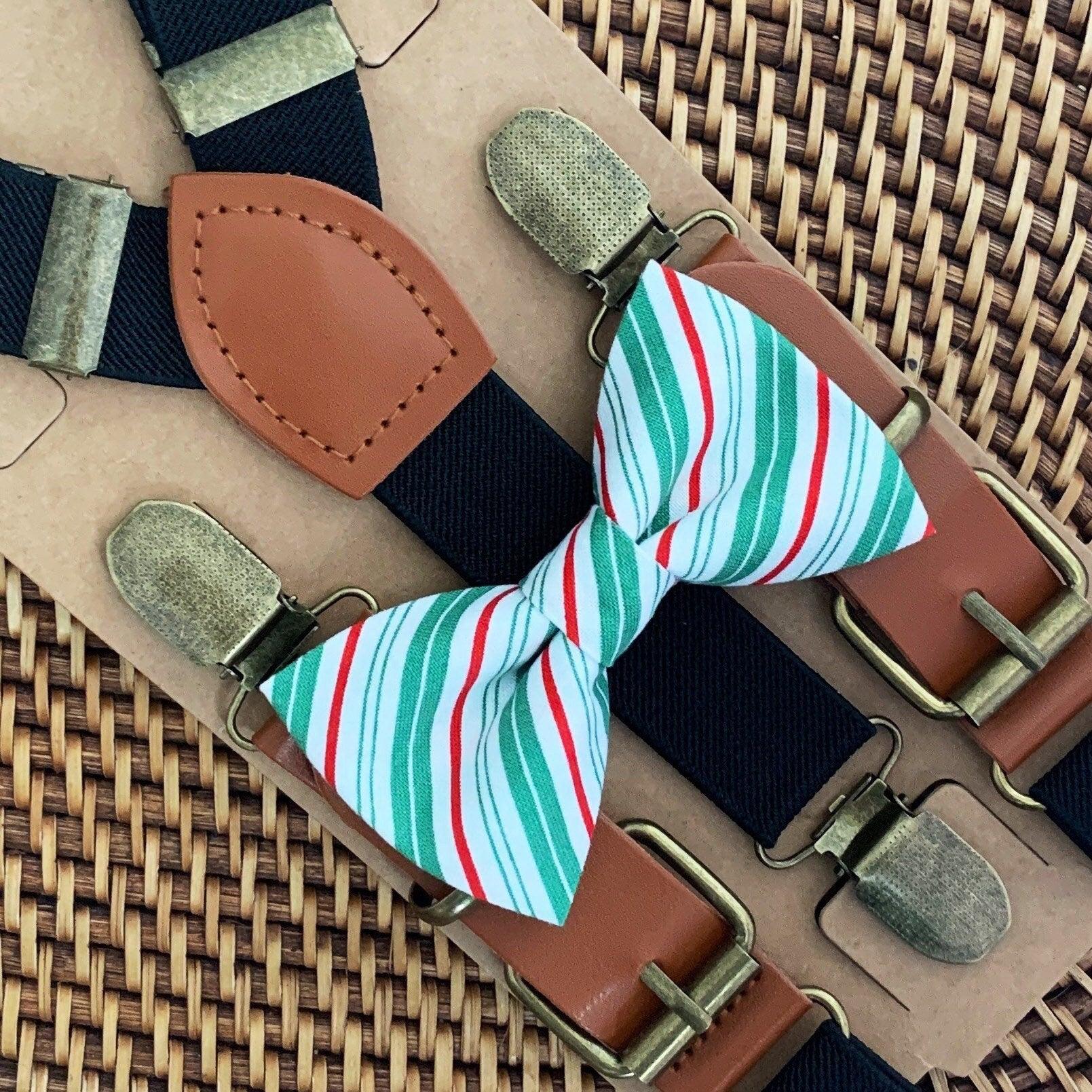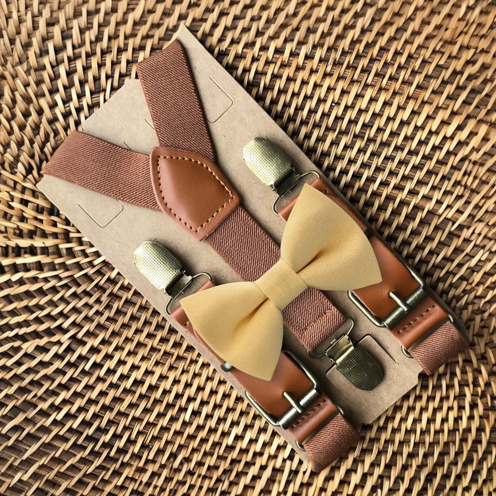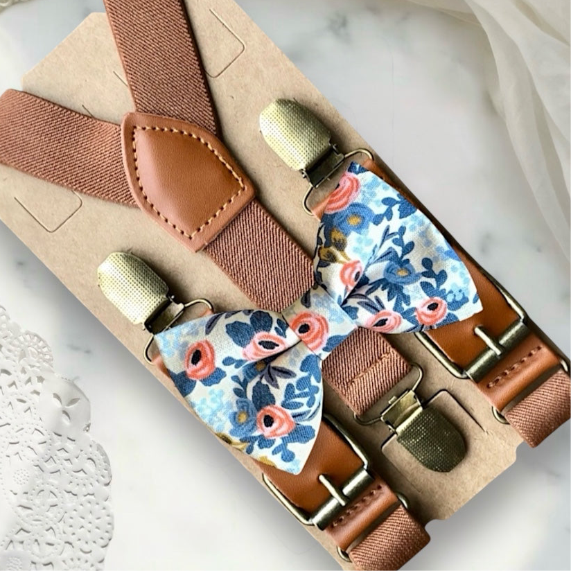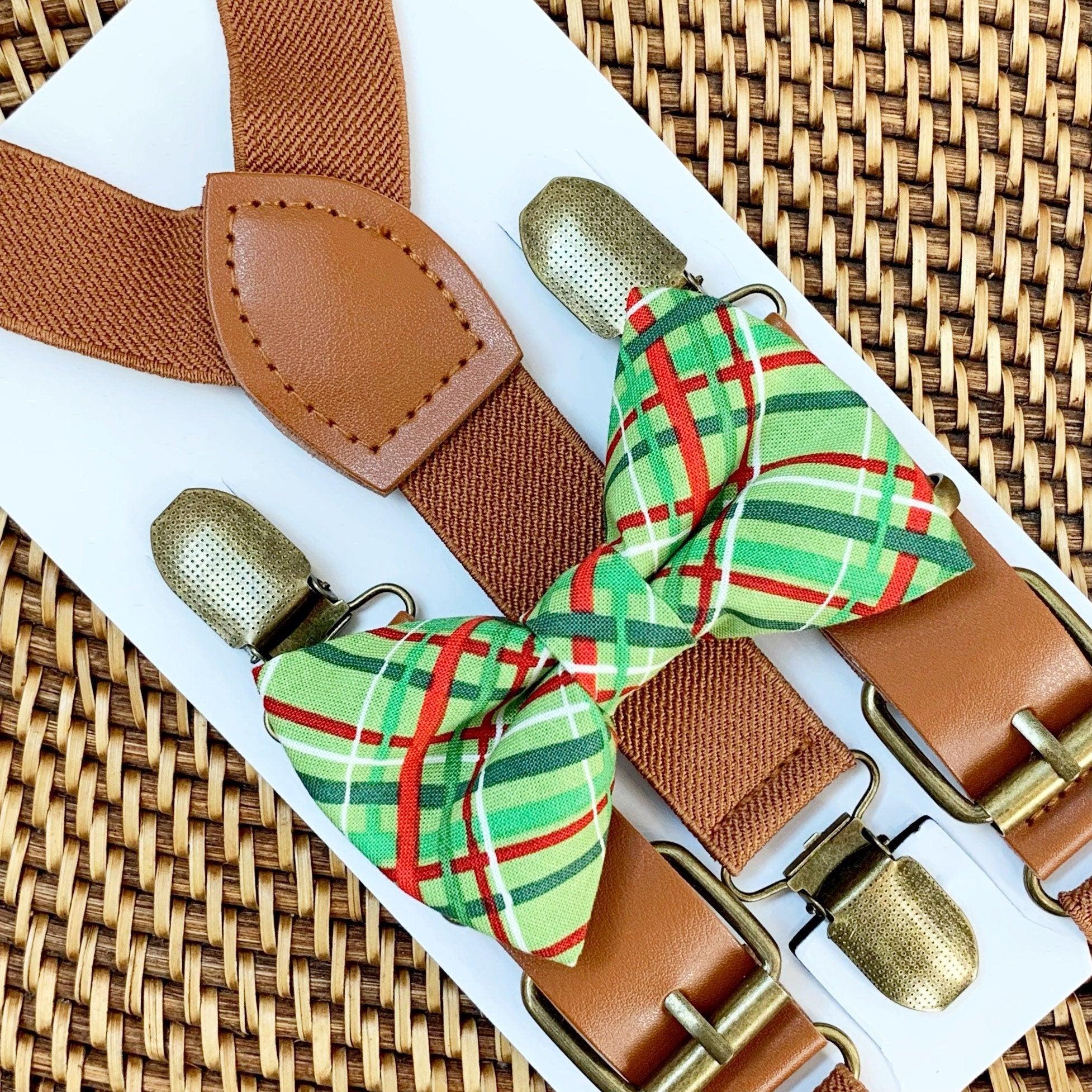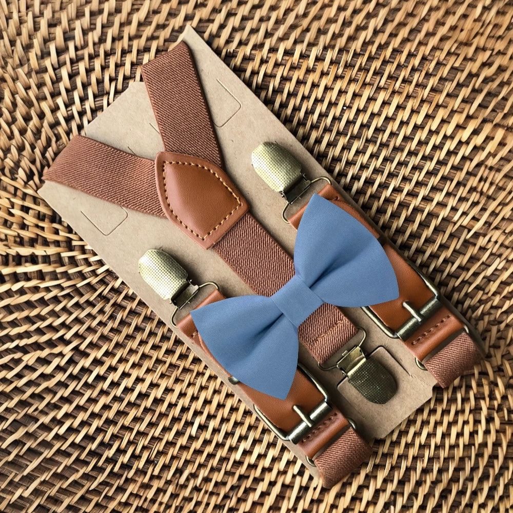 Elastic suspenders with vegan leather buckles matched with some of our best-selling bow ties to complete your outfit. Each set includes a suspender and bow tie. Our pre tied bow ties are PERFECT for groomsmen, ring bearer outfit, wedding, work suspenders, women's suspenders, leather suspenders or any other special occasion!