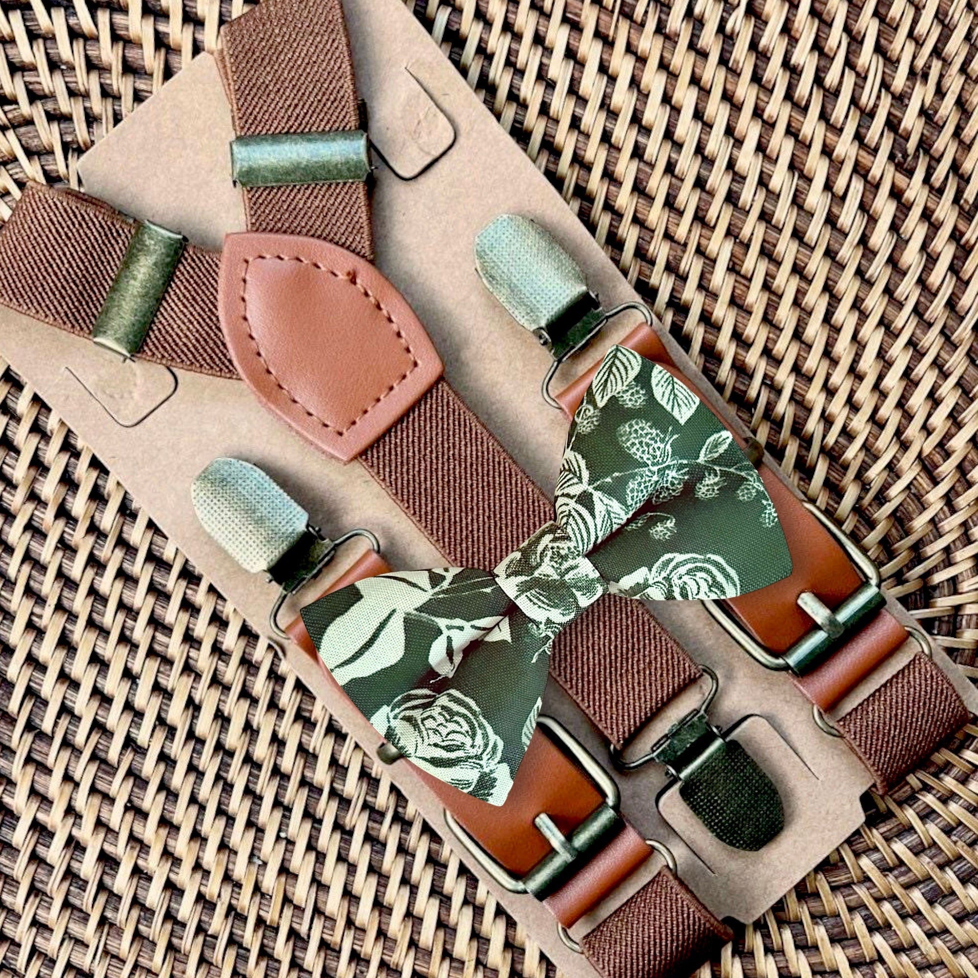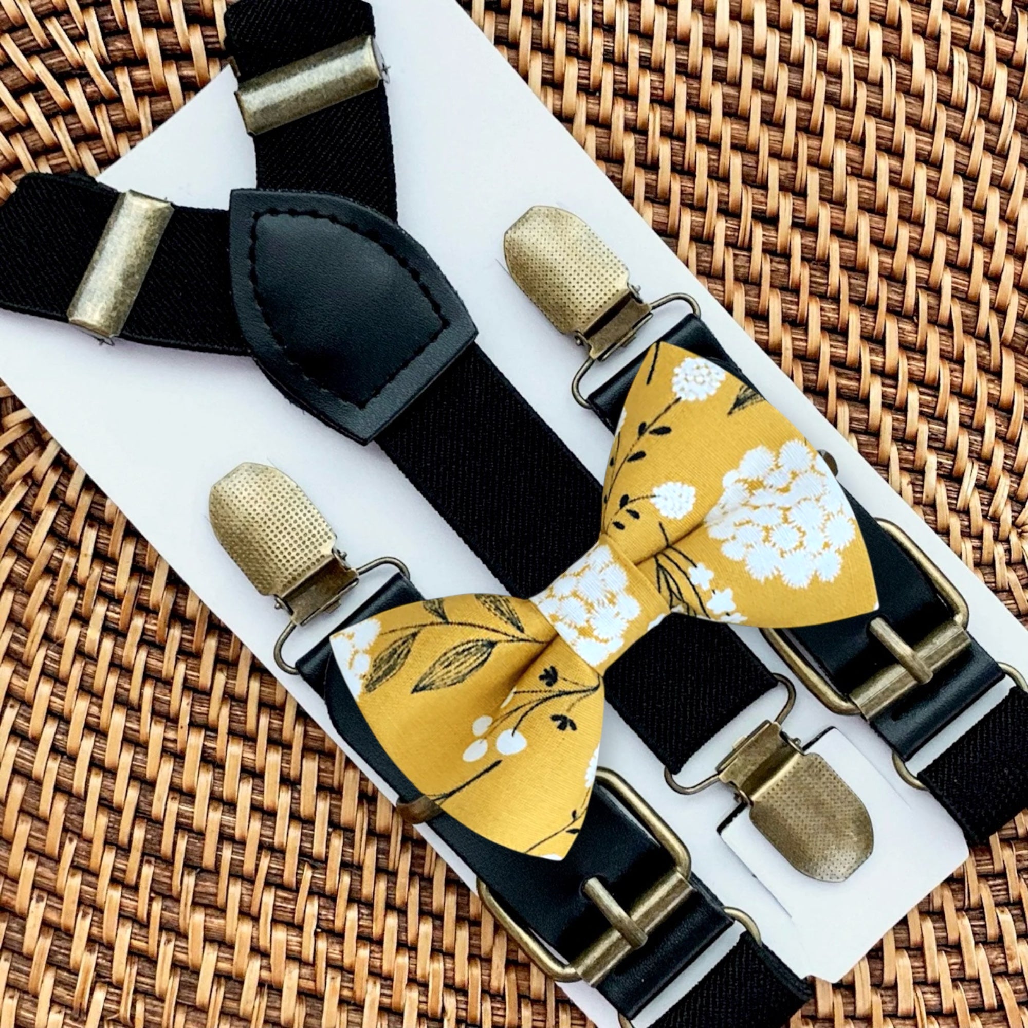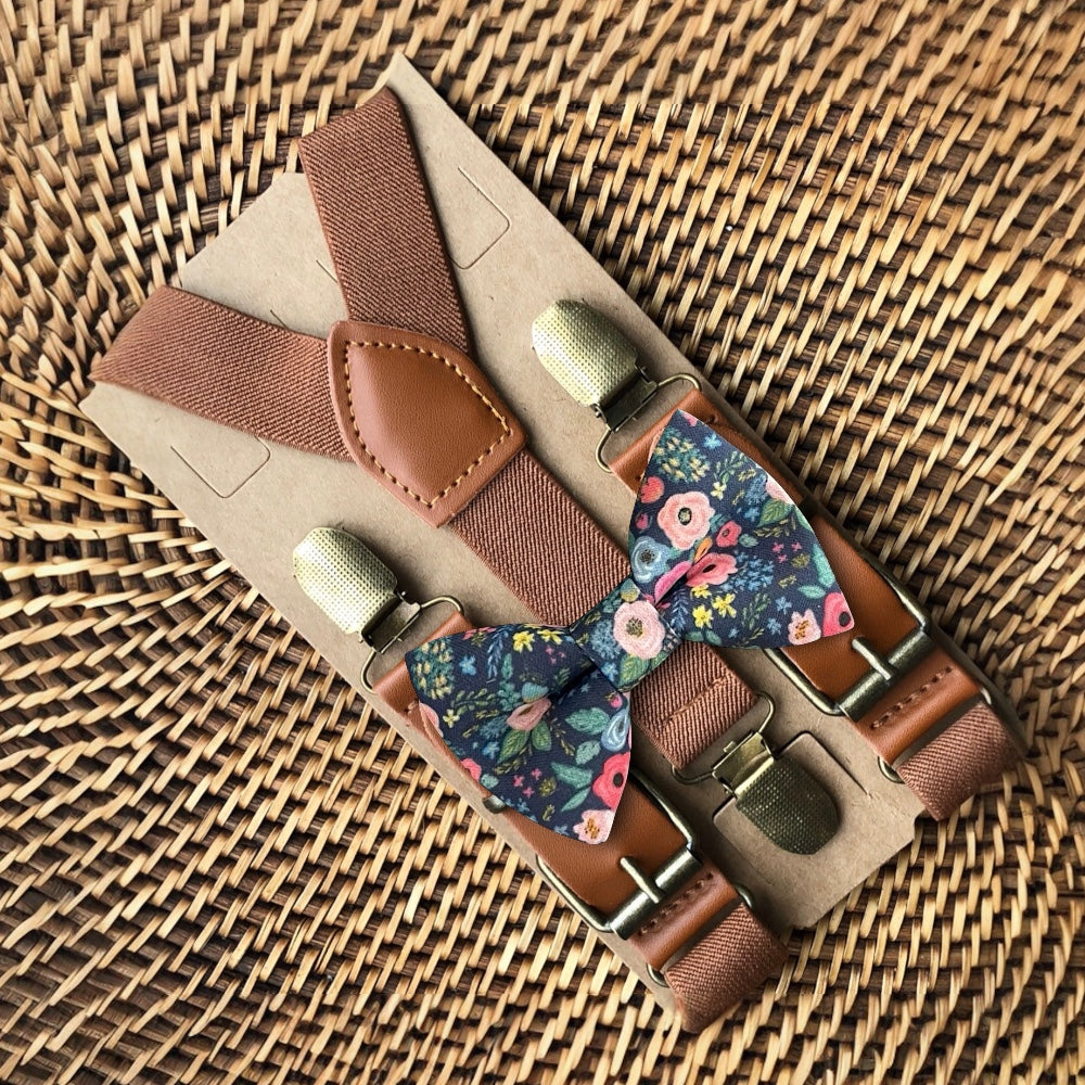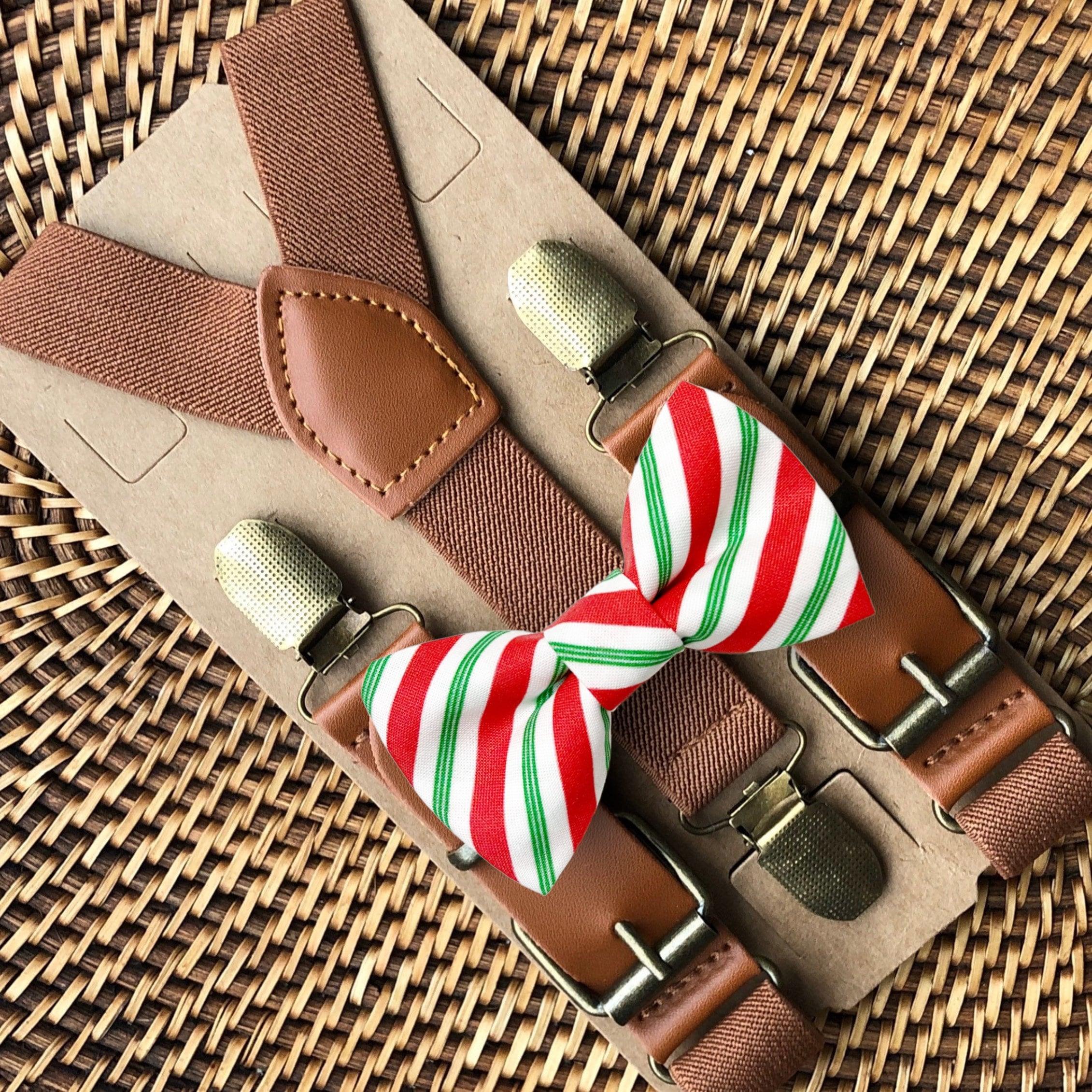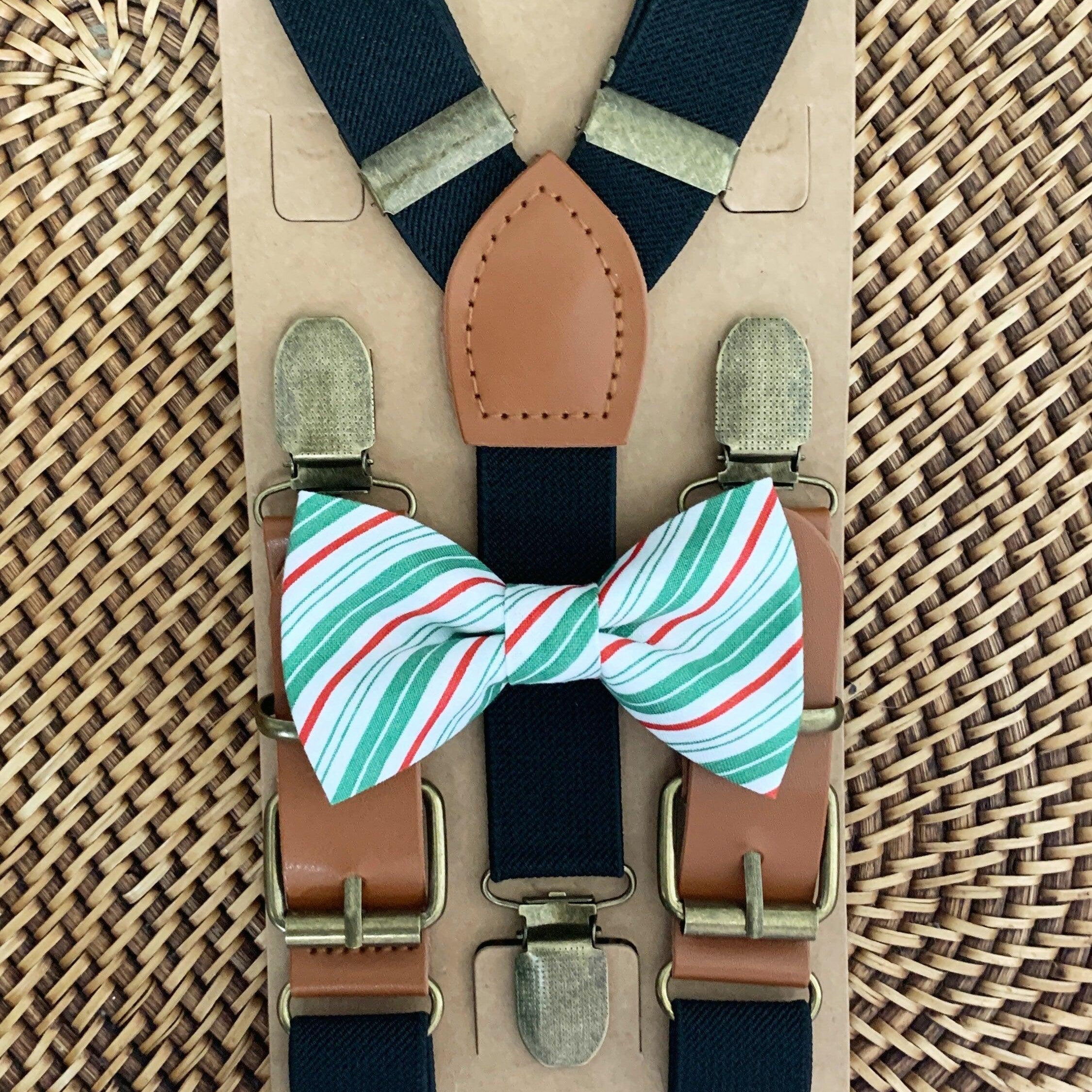 Elastic suspenders with vegan leather buckles matched with some of our best-selling bow ties to complete your outfit. Each set includes a suspender and bow tie. Our pre tied bow ties are PERFECT for groomsmen, ring bearer outfit, wedding, work suspenders, women's suspenders, leather suspenders or any other special occasion!