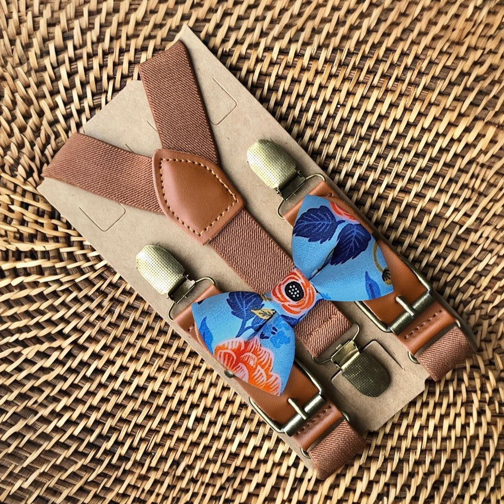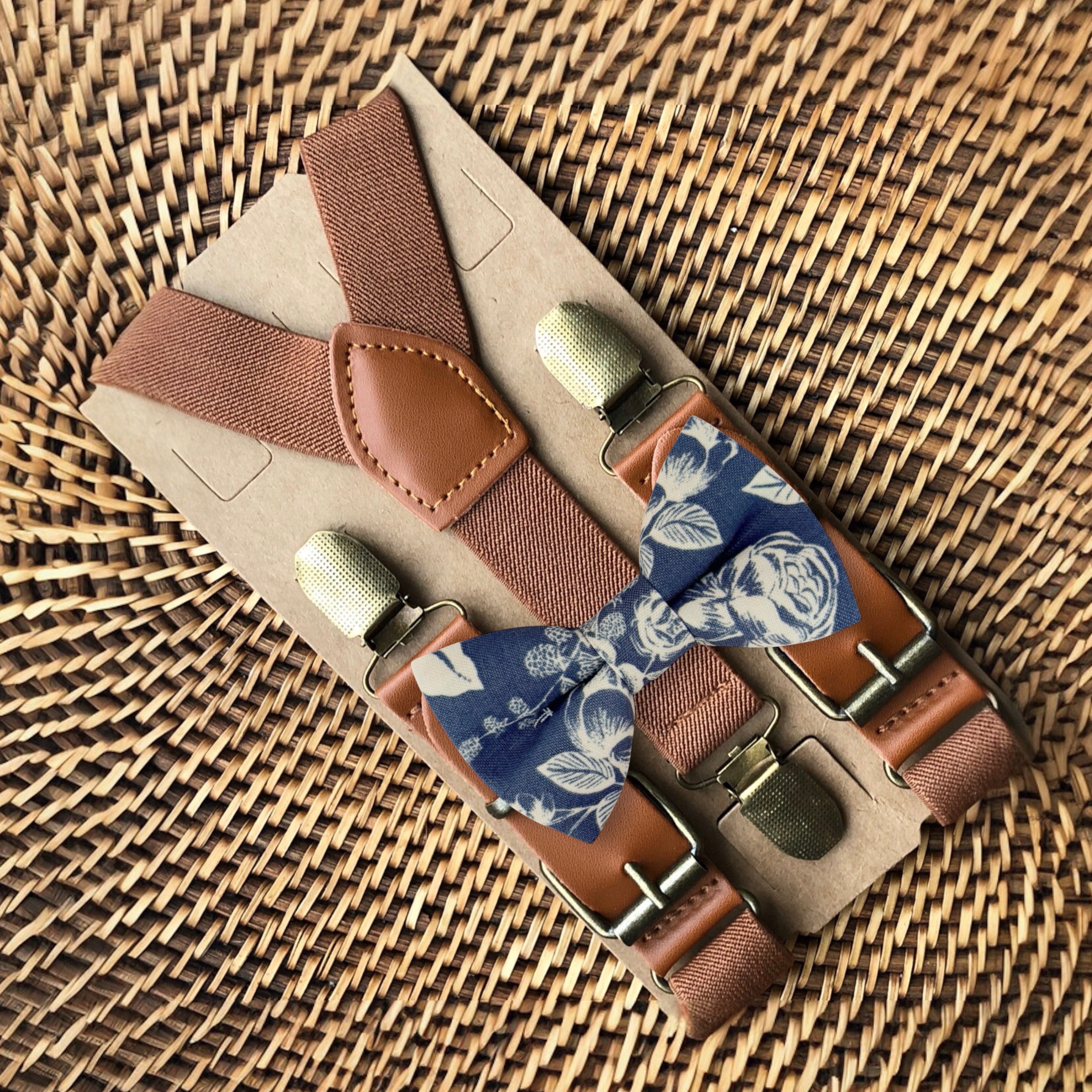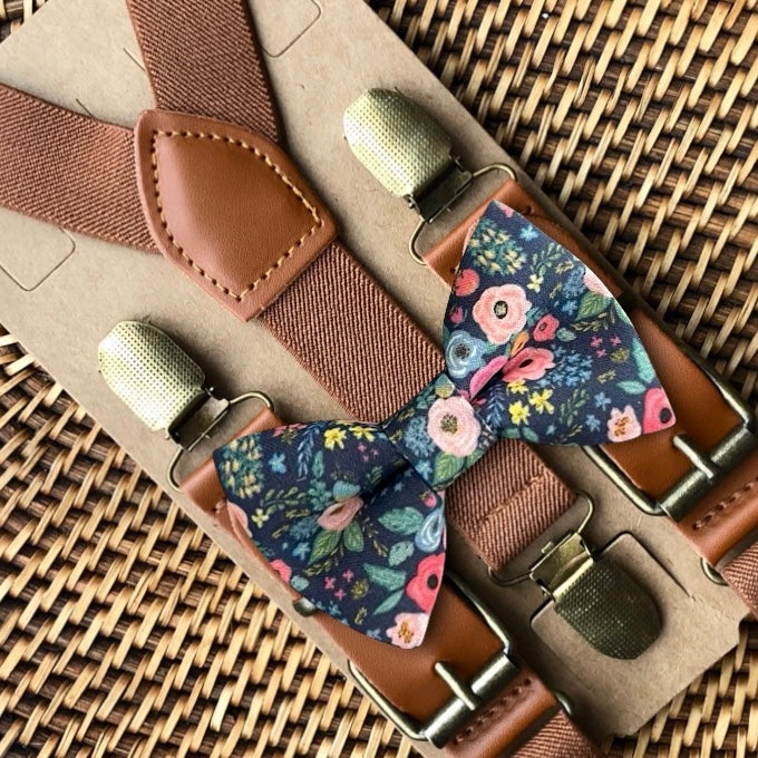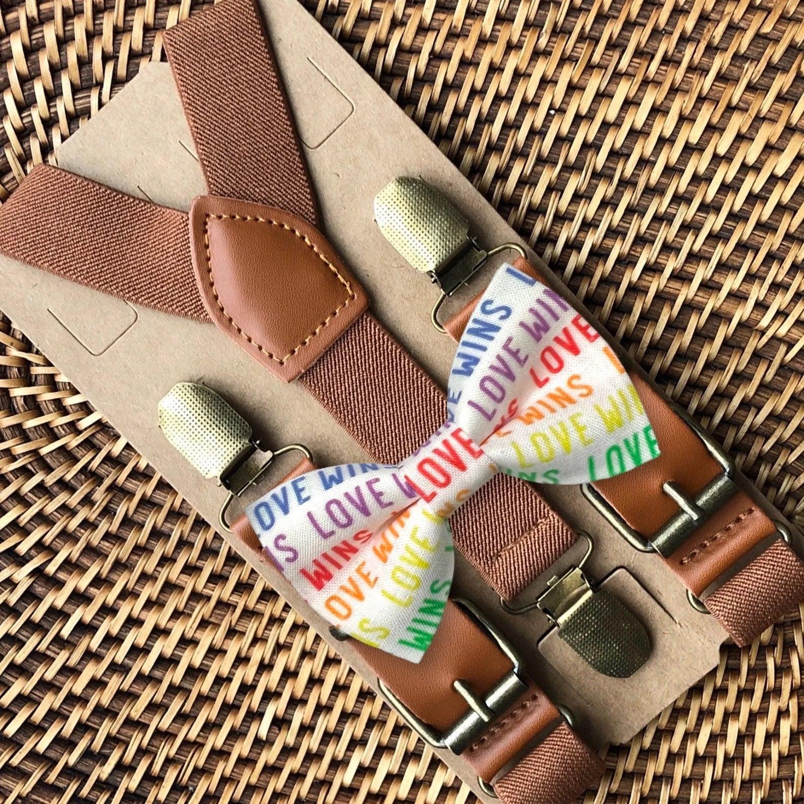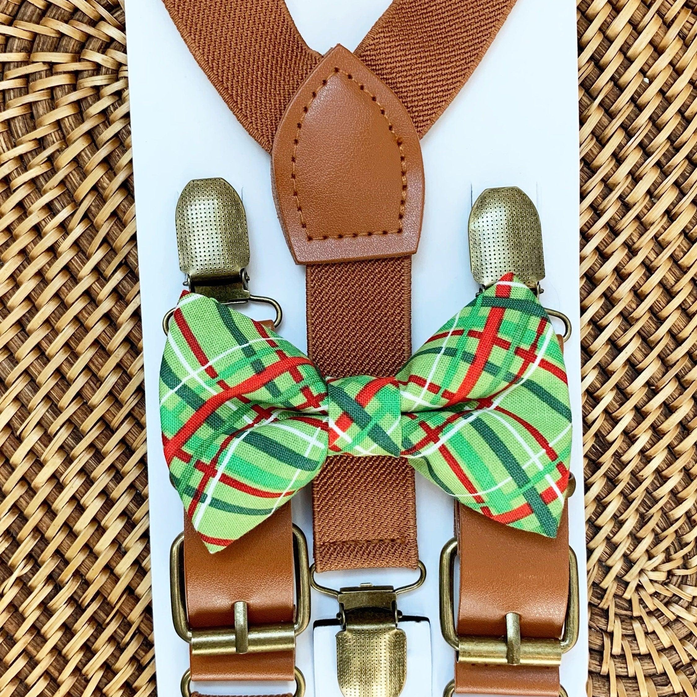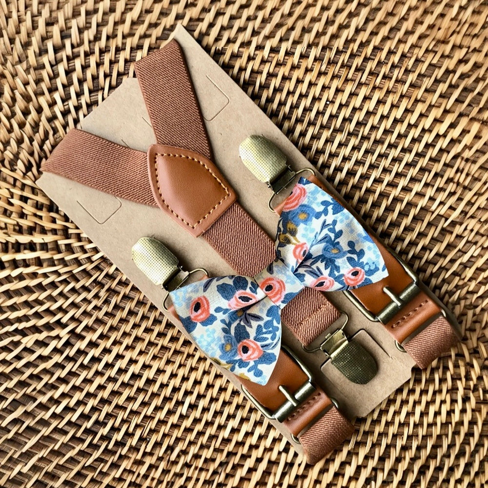 Elastic suspenders with vegan leather buckles matched with some of our best-selling bow ties to complete your outfit. Each set includes a suspender and bow tie. Our pre tied bow ties are PERFECT for groomsmen, ring bearer outfit, wedding, work suspenders, women's suspenders, leather suspenders or any other special occasion!