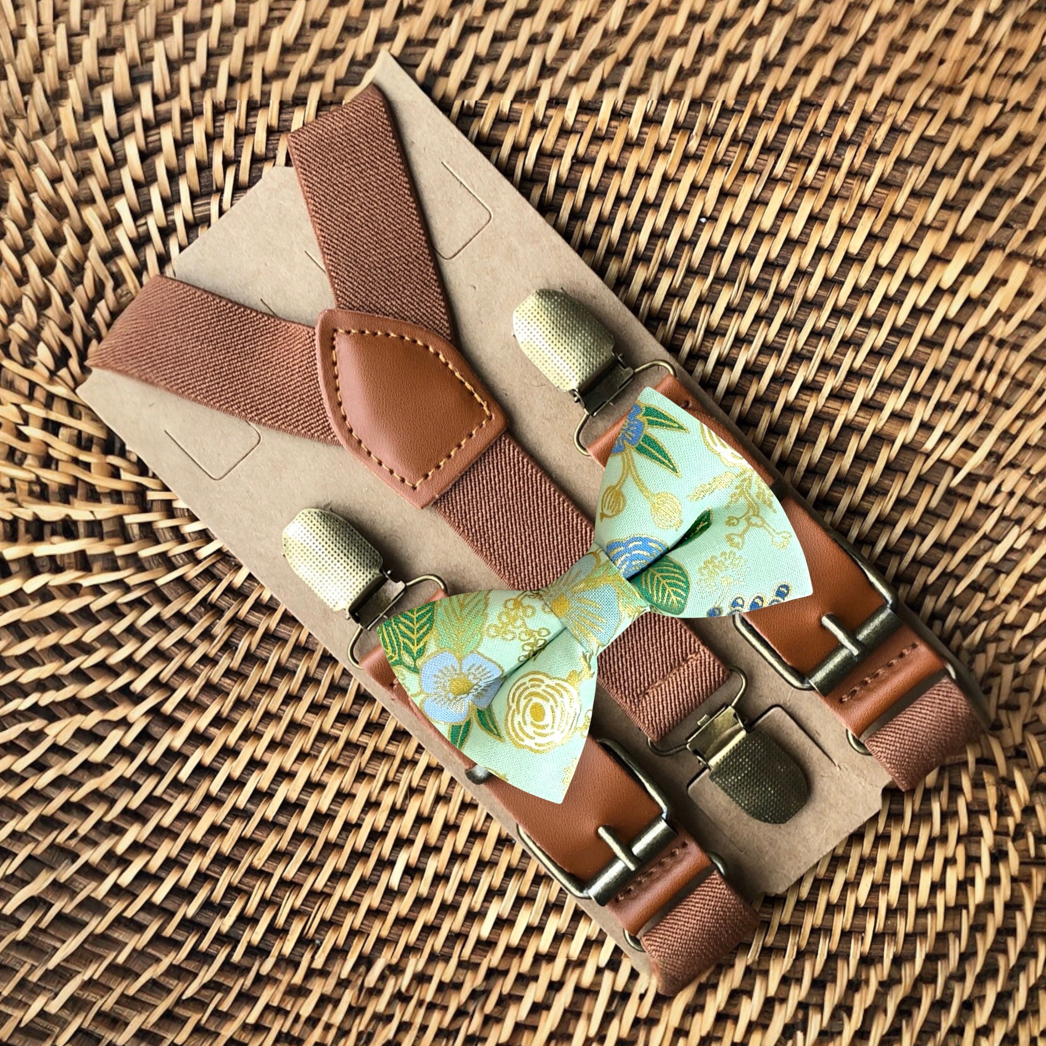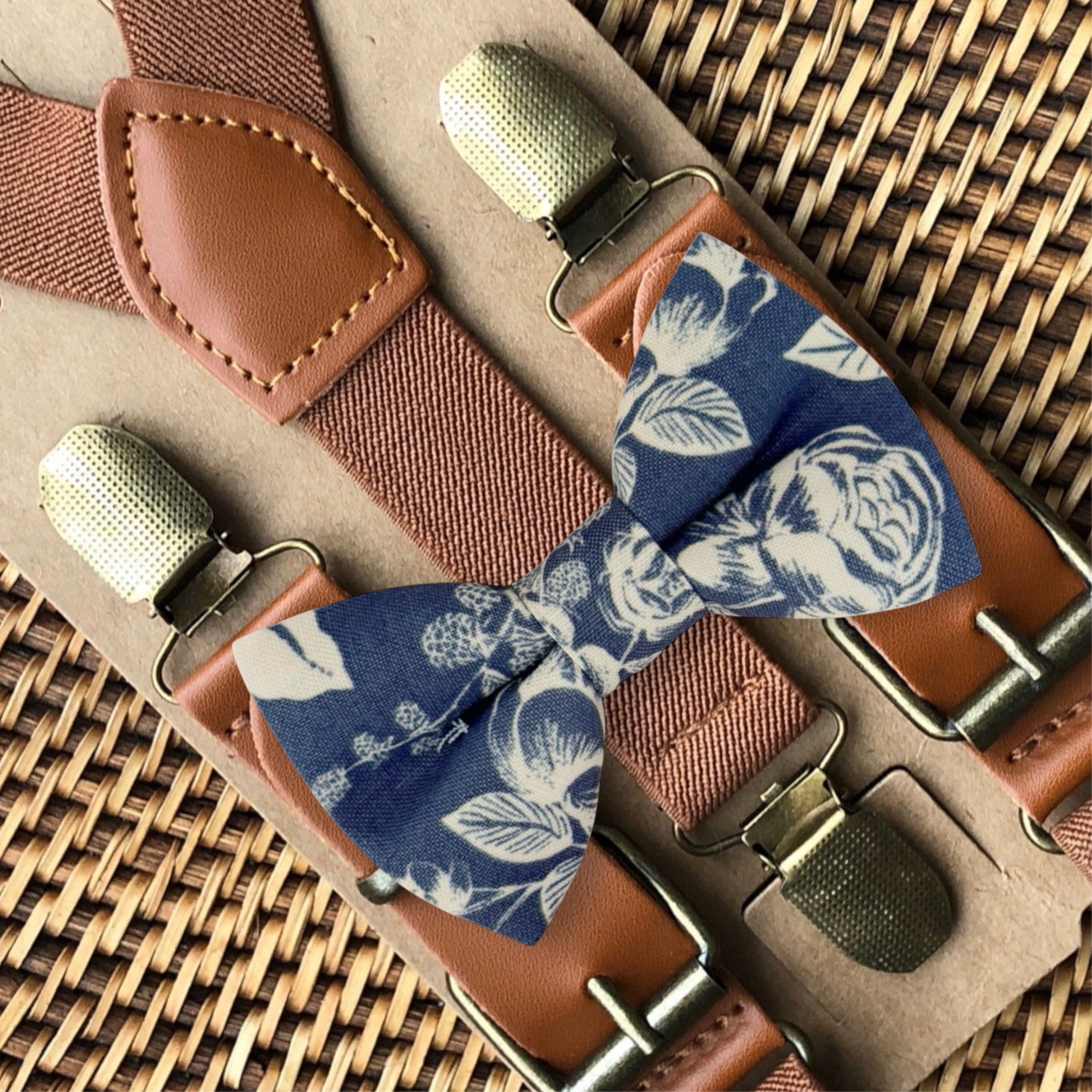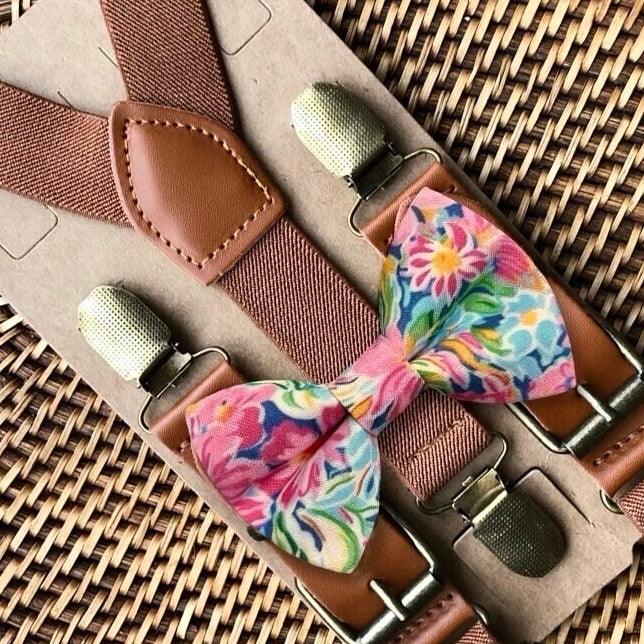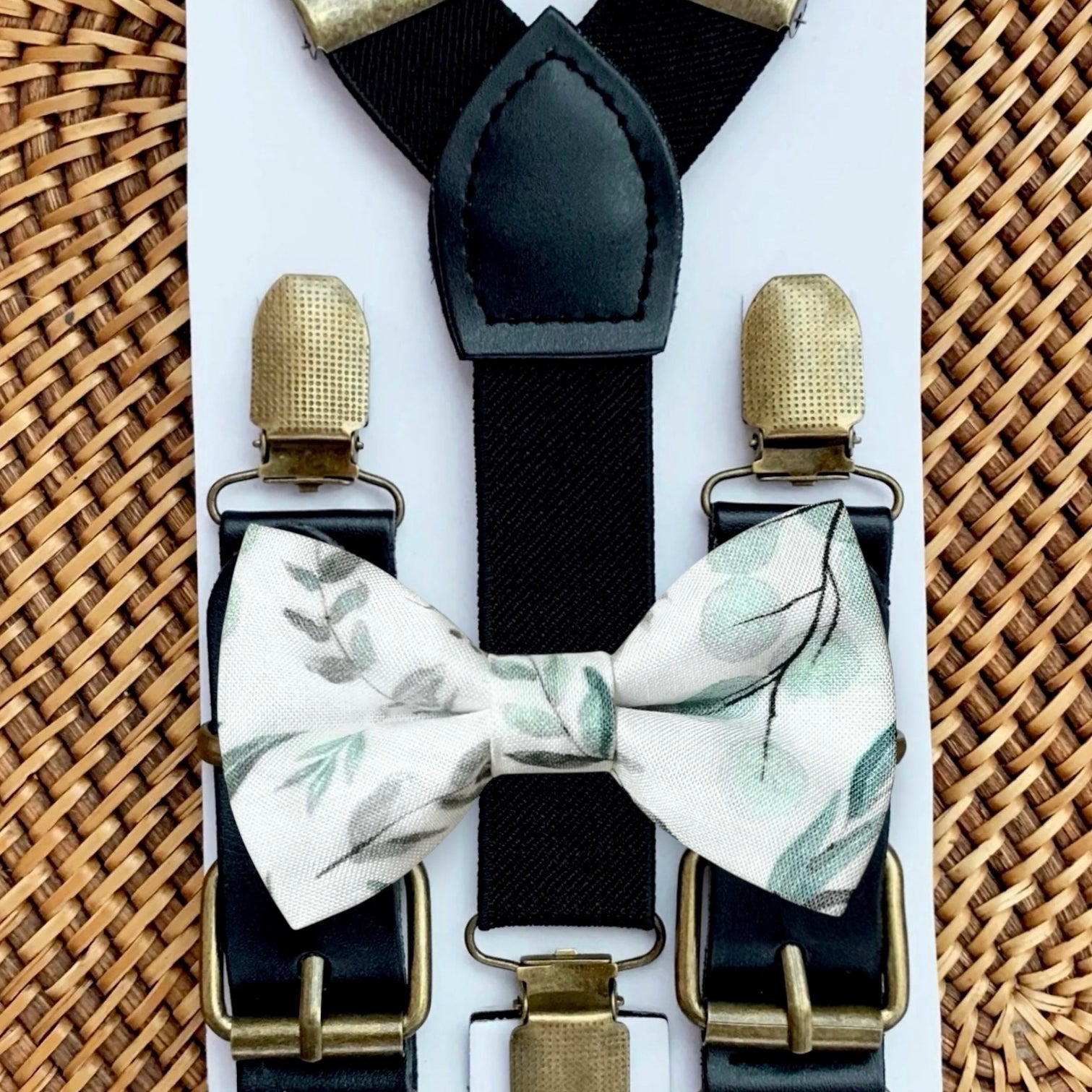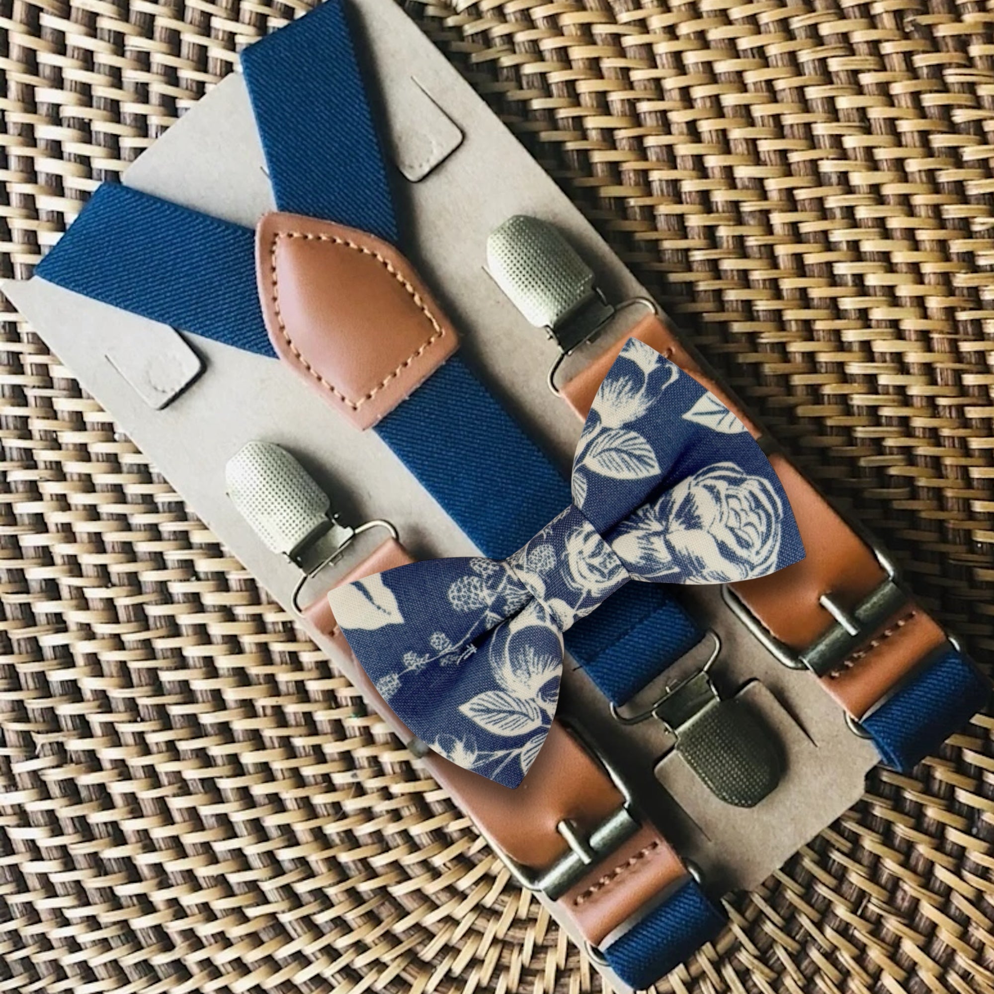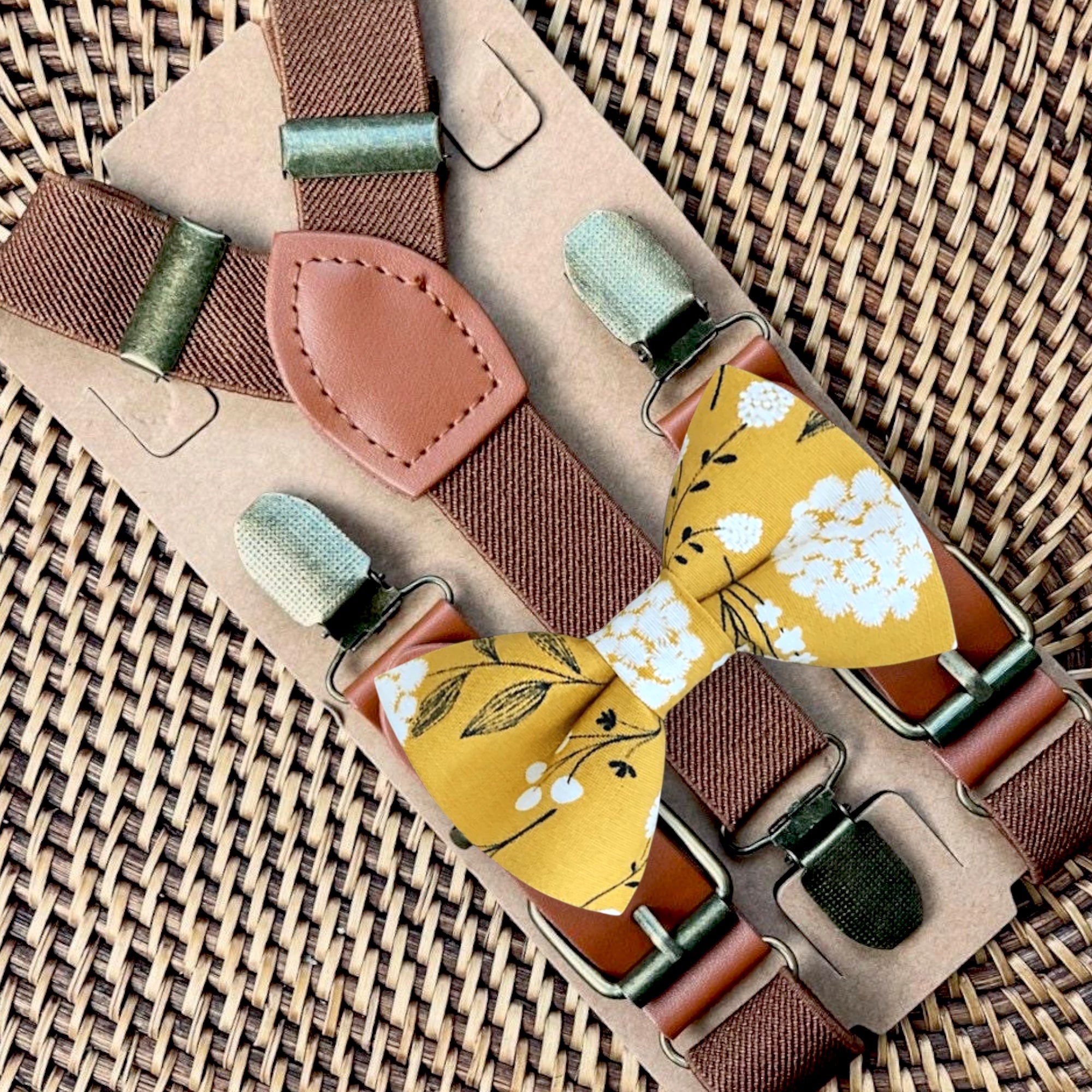 Elastic suspenders with vegan leather buckles matched with some of our best-selling bow ties to complete your outfit. Each set includes a suspender and bow tie. Our pre tied bow ties are PERFECT for groomsmen, ring bearer outfit, wedding, work suspenders, women's suspenders, leather suspenders or any other special occasion!