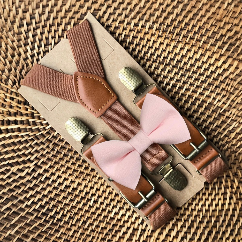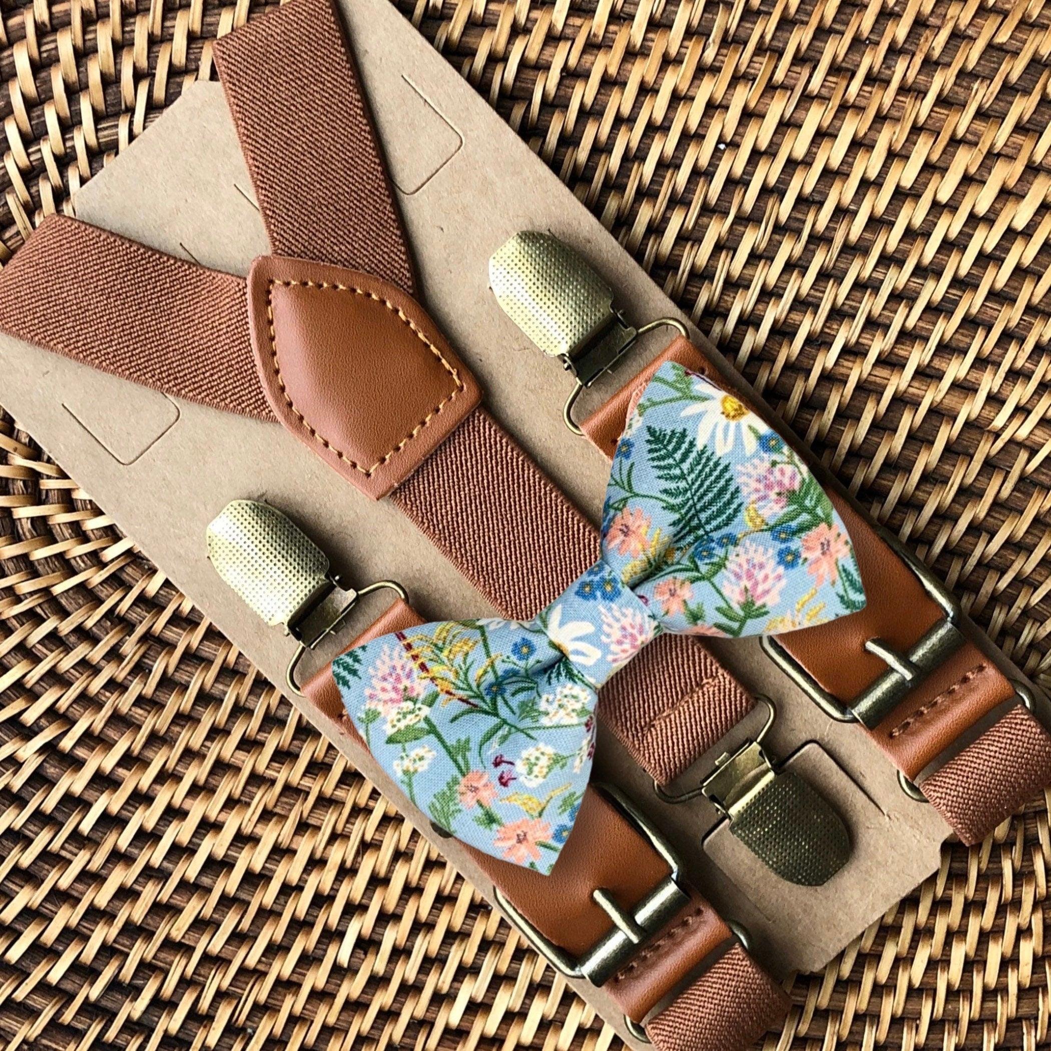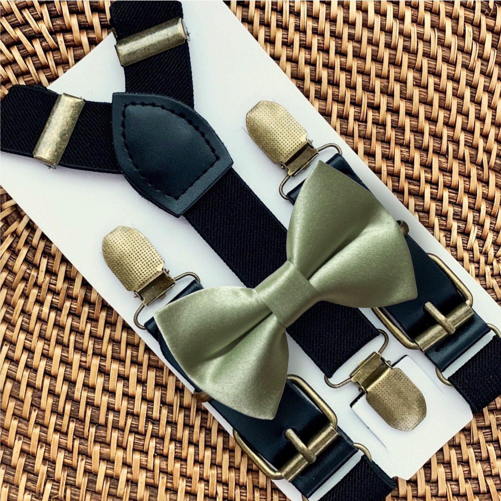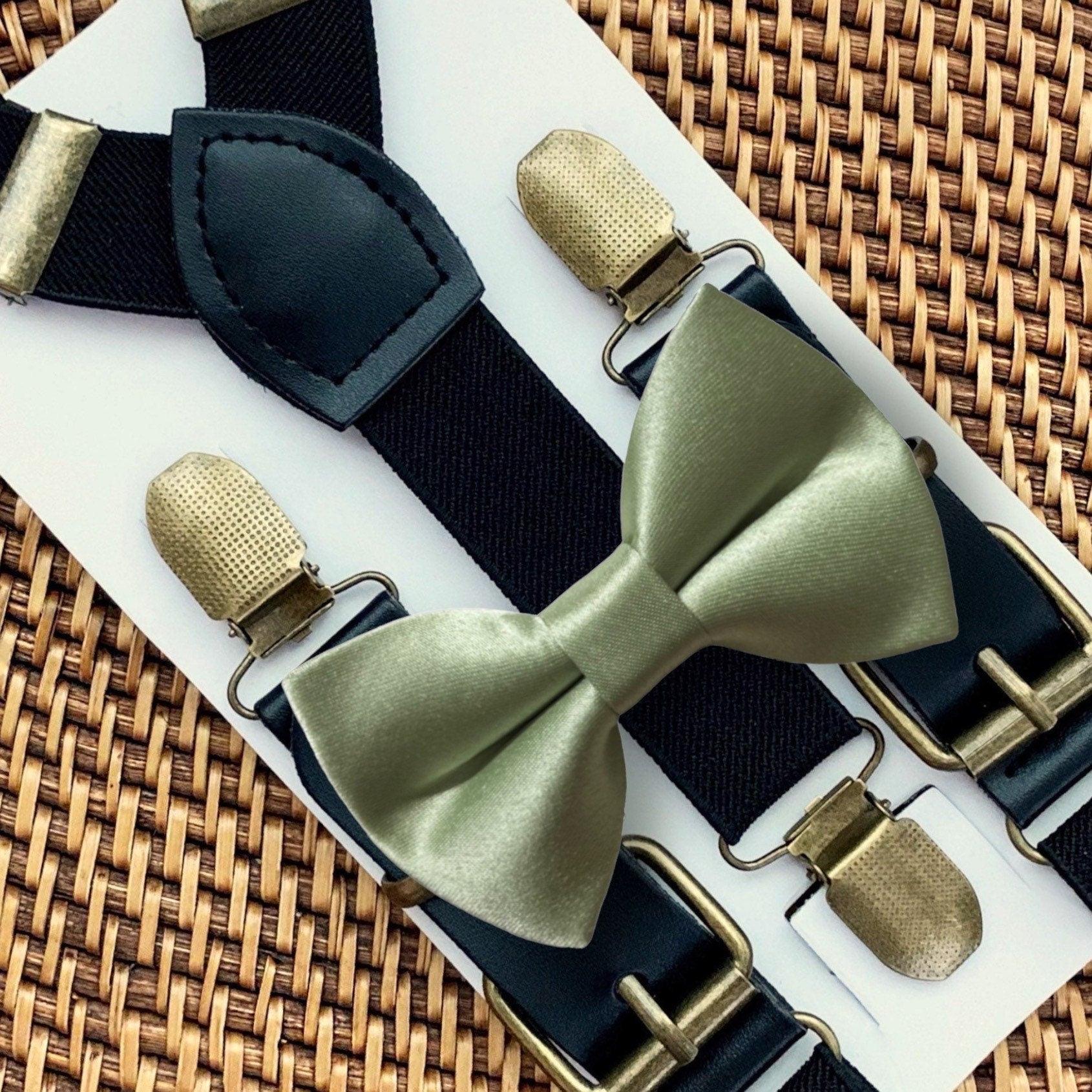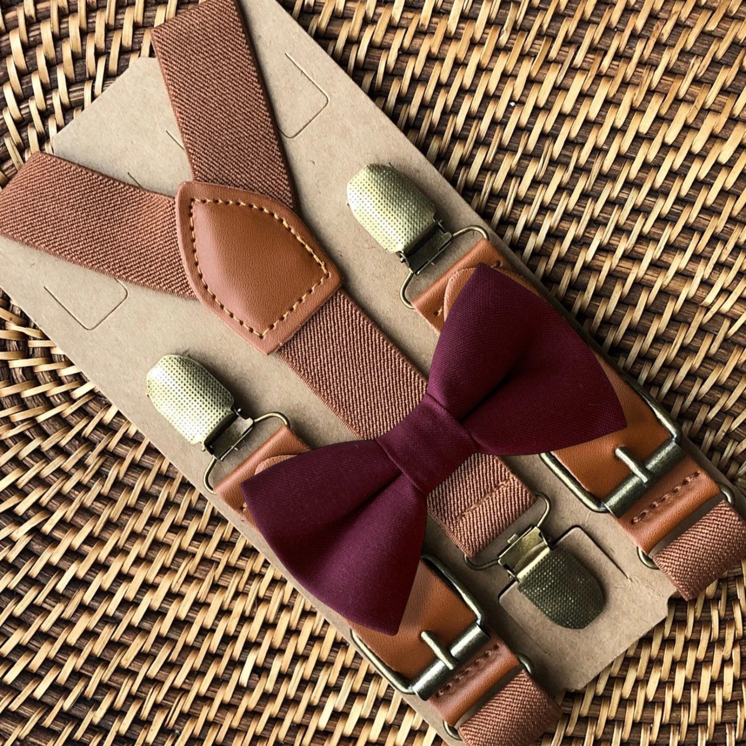 Elastic suspenders with vegan leather buckles matched with some of our best-selling bow ties to complete your outfit. Each set includes a suspender and bow tie. Our pre tied bow ties are PERFECT for groomsmen, ring bearer outfit, wedding, work suspenders, women's suspenders, leather suspenders or any other special occasion!