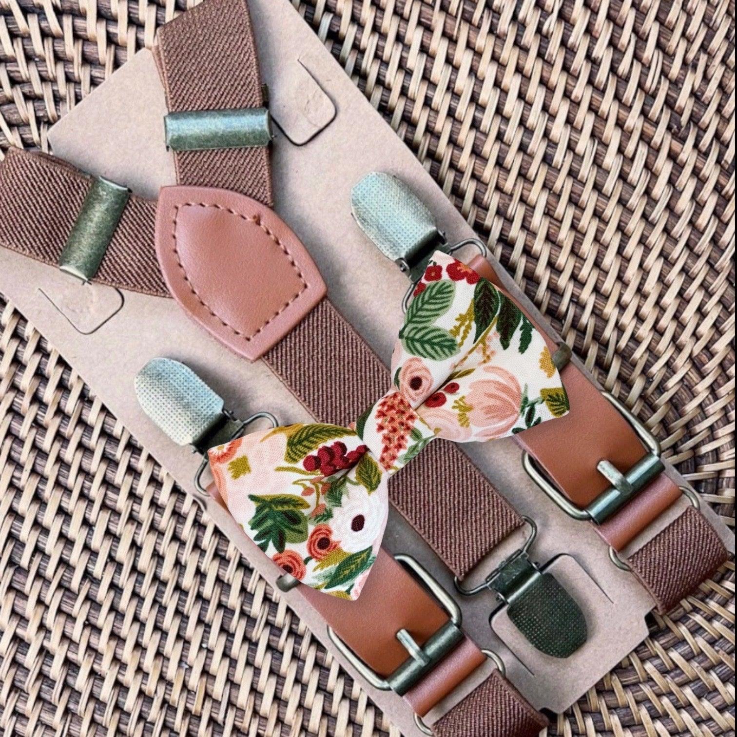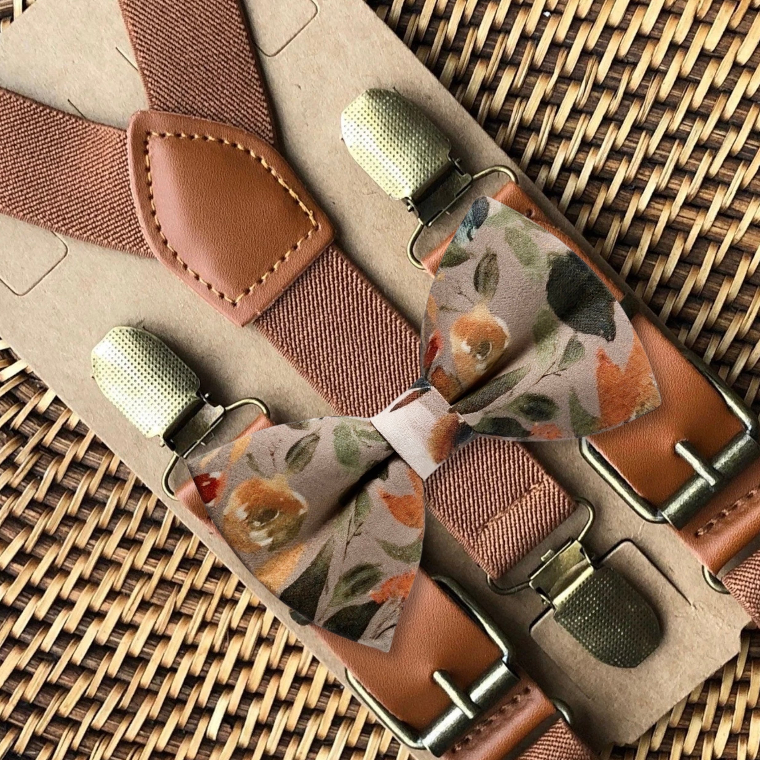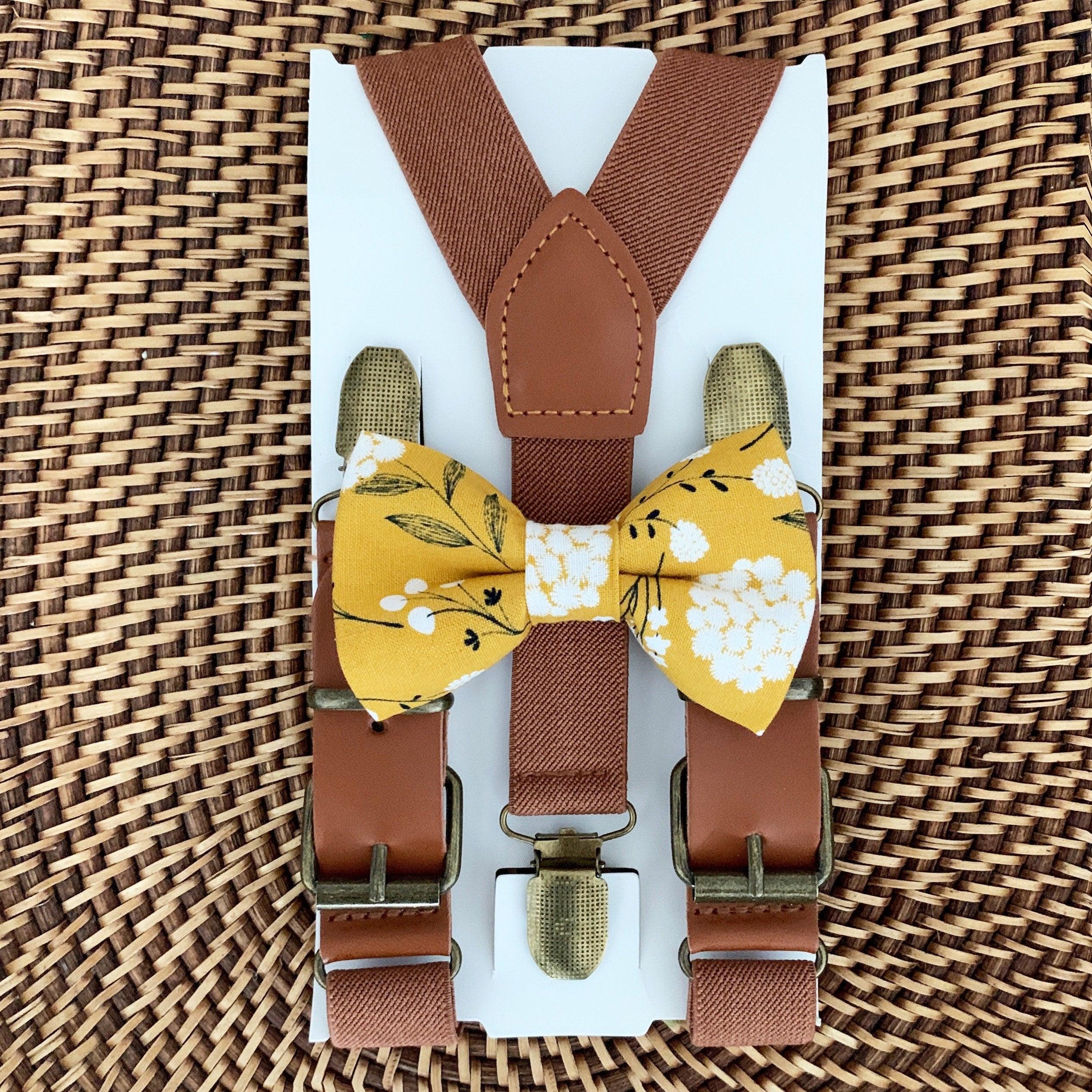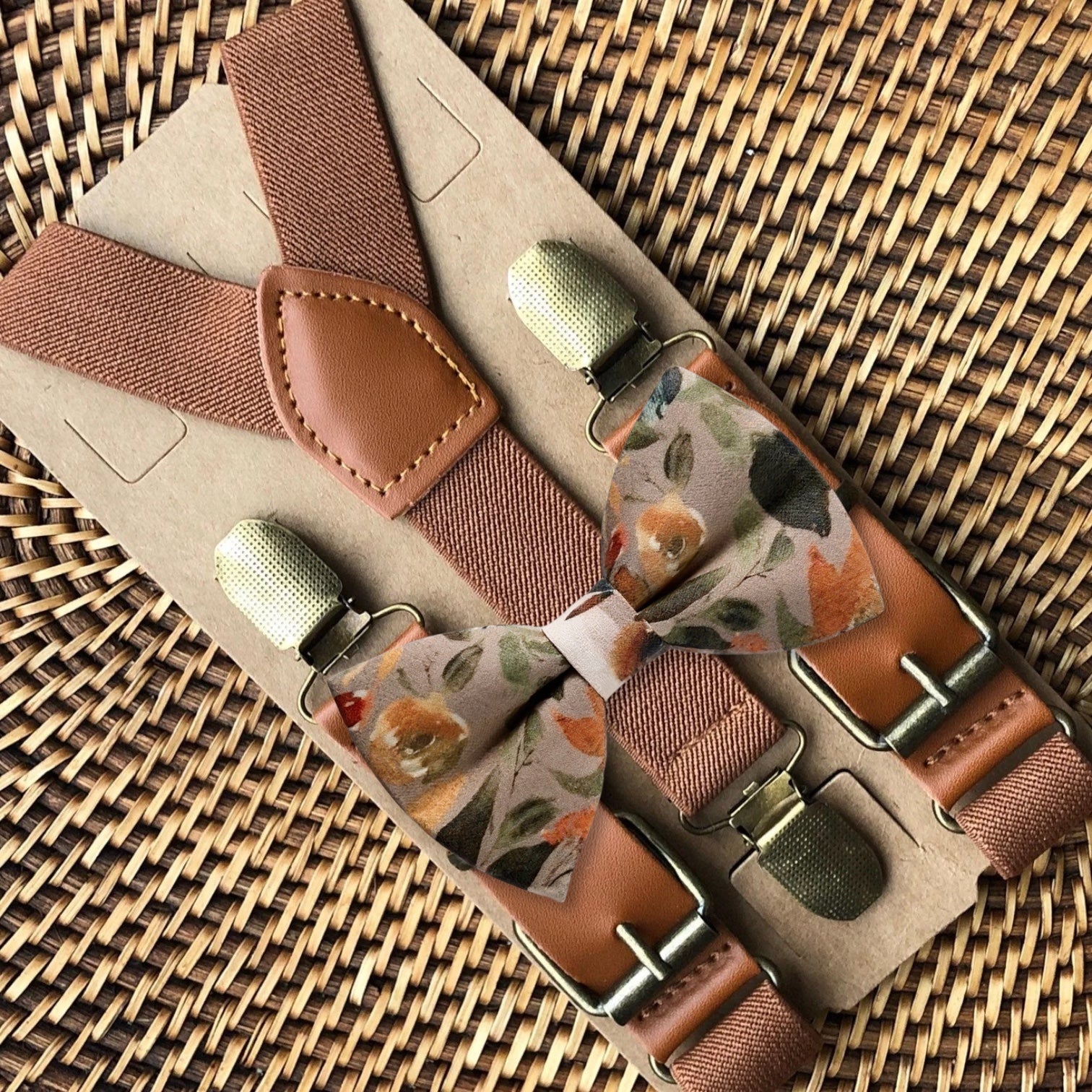Elastic suspenders with vegan leather buckles matched with some of our best-selling bow ties to complete your outfit. Each set includes a suspender and bow tie. Our pre tied bow ties are PERFECT for groomsmen, ring bearer outfit, wedding, work suspenders, women's suspenders, leather suspenders or any other special occasion!