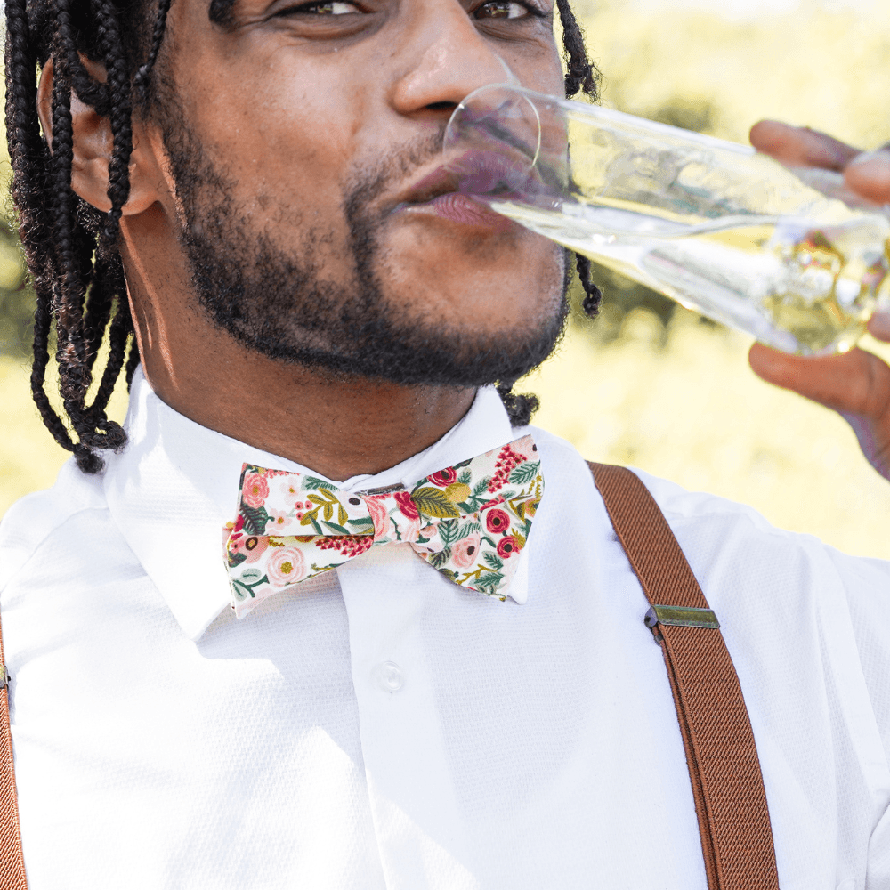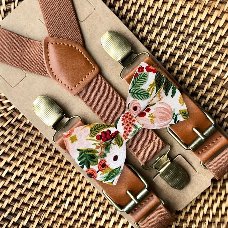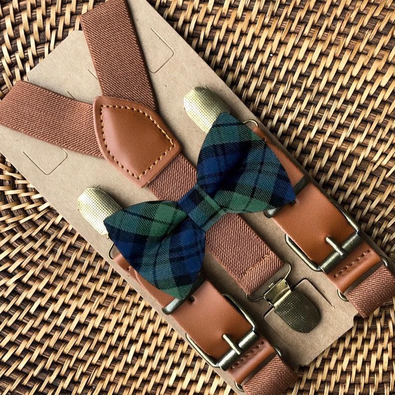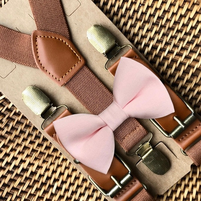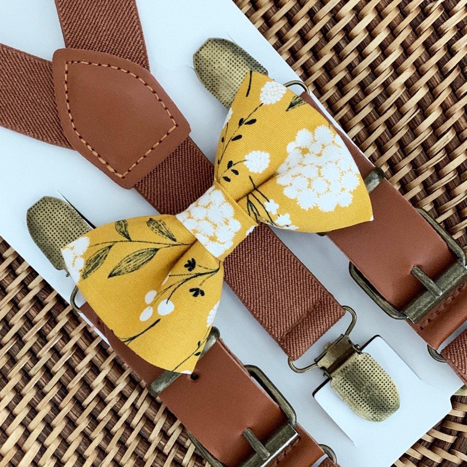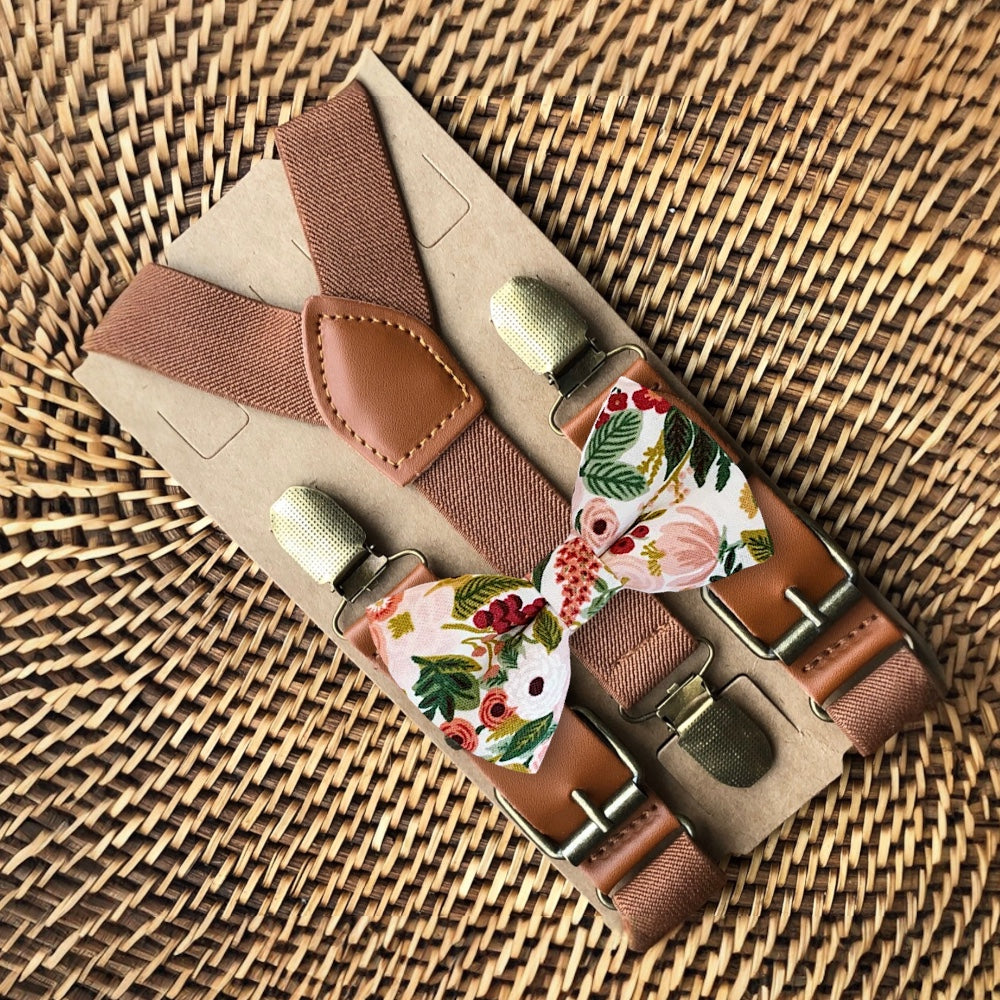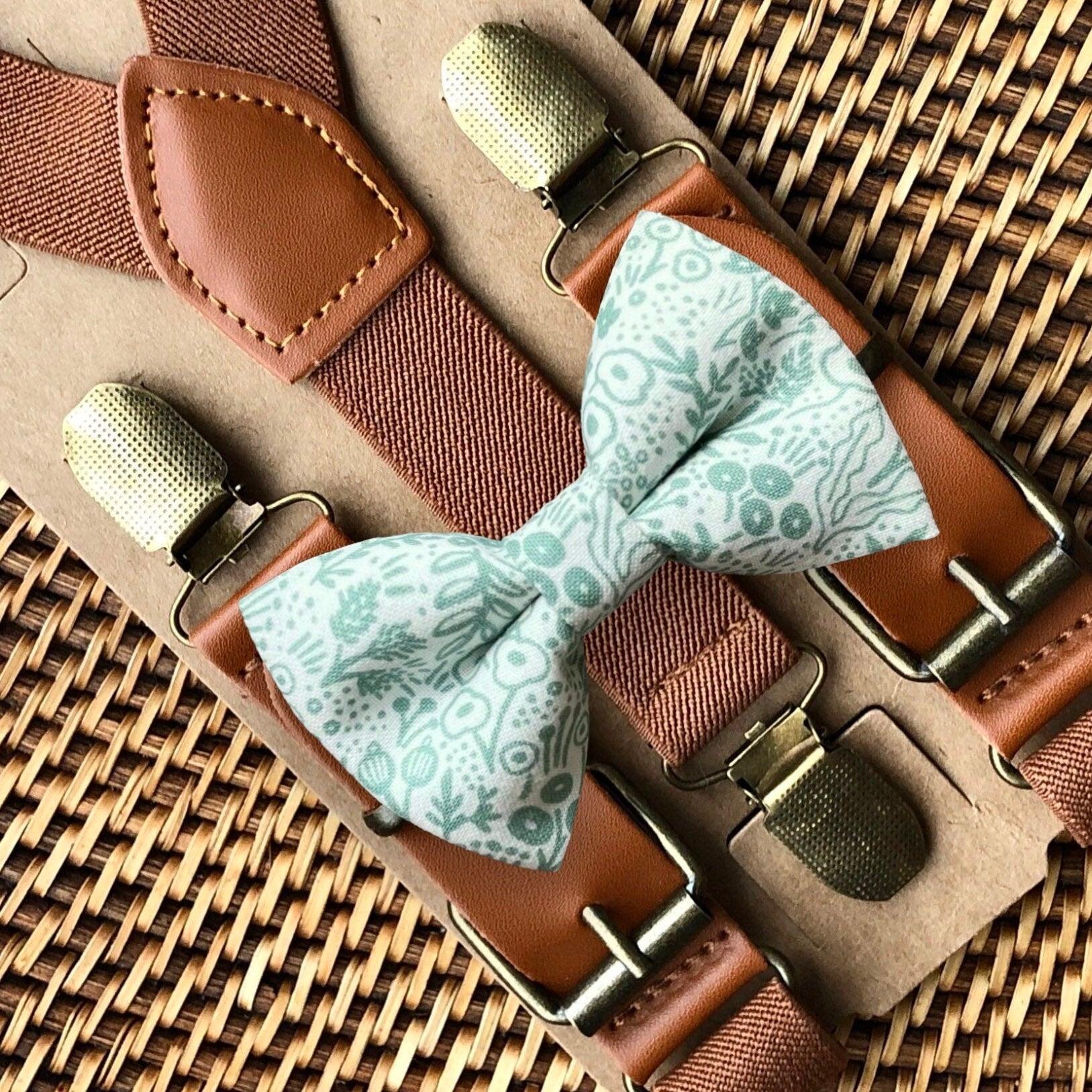 Elastic suspenders with vegan leather buckles matched with some of our best-selling bow ties to complete your outfit. Each set includes a suspender and bow tie. Our pre tied bow ties are PERFECT for groomsmen, ring bearer outfit, wedding, work suspenders, women's suspenders, leather suspenders or any other special occasion!