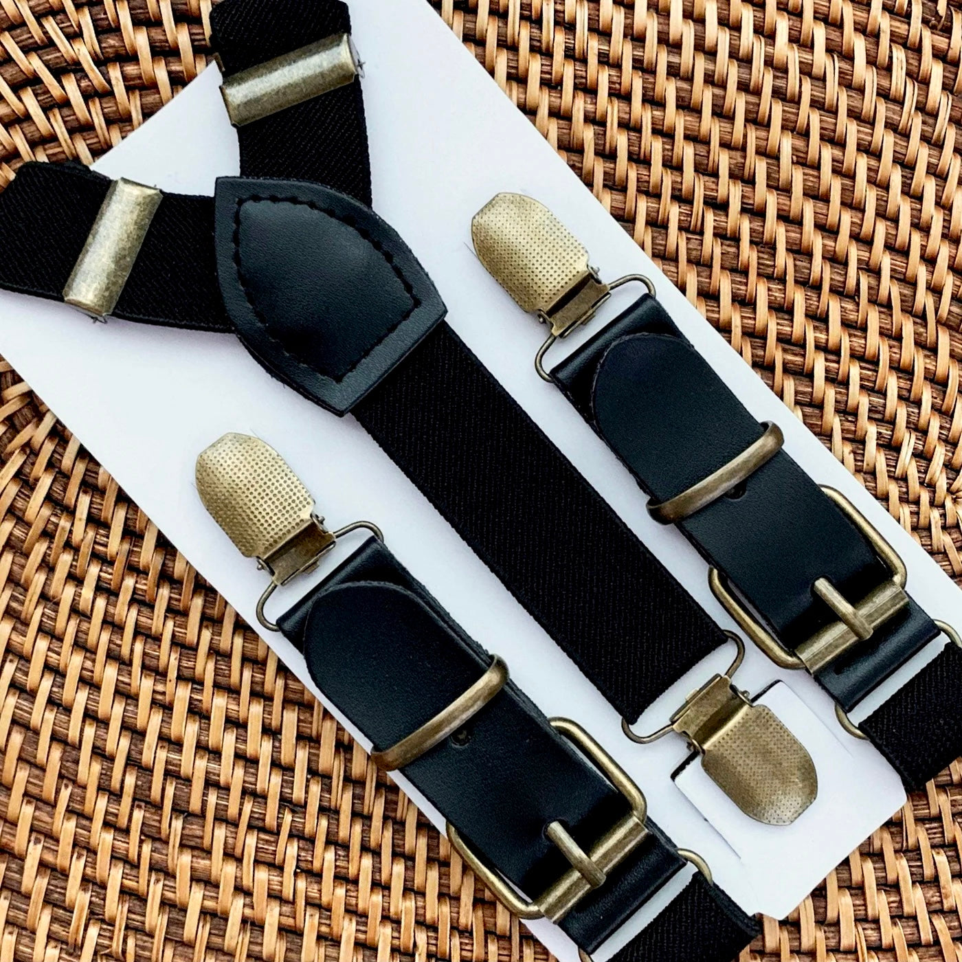 Black Buckle Suspenders with Brass Clips- Your special guy will look so dashing when he shows up wearing these faux leather buckle suspenders! Our suspenders are a great choice for family photos, weddings, ring bearer outfits, birthday celebrations, or any other special occasion.