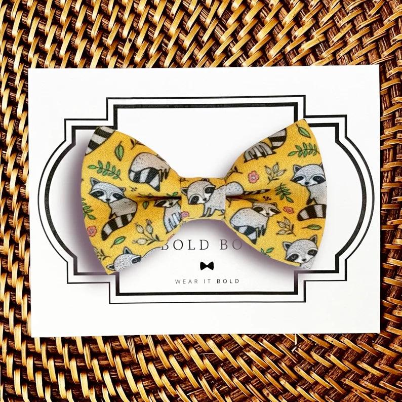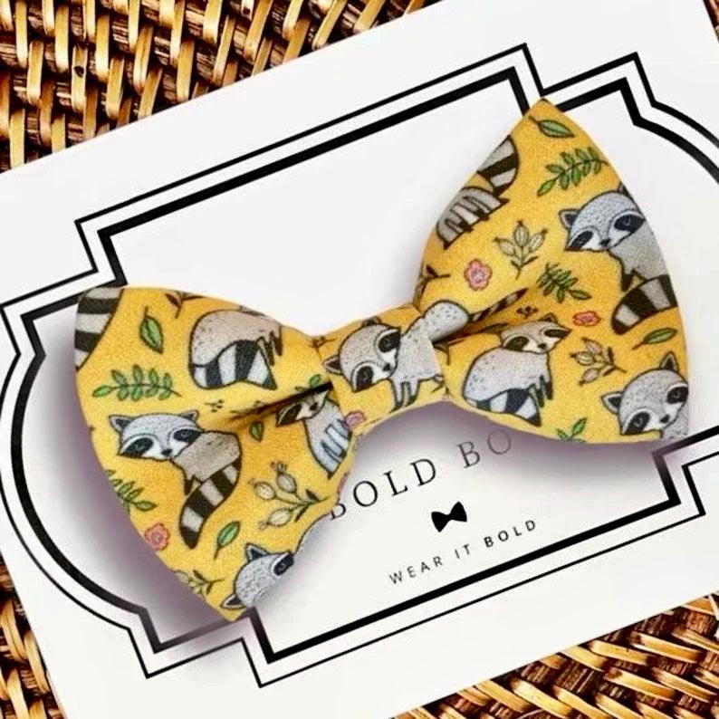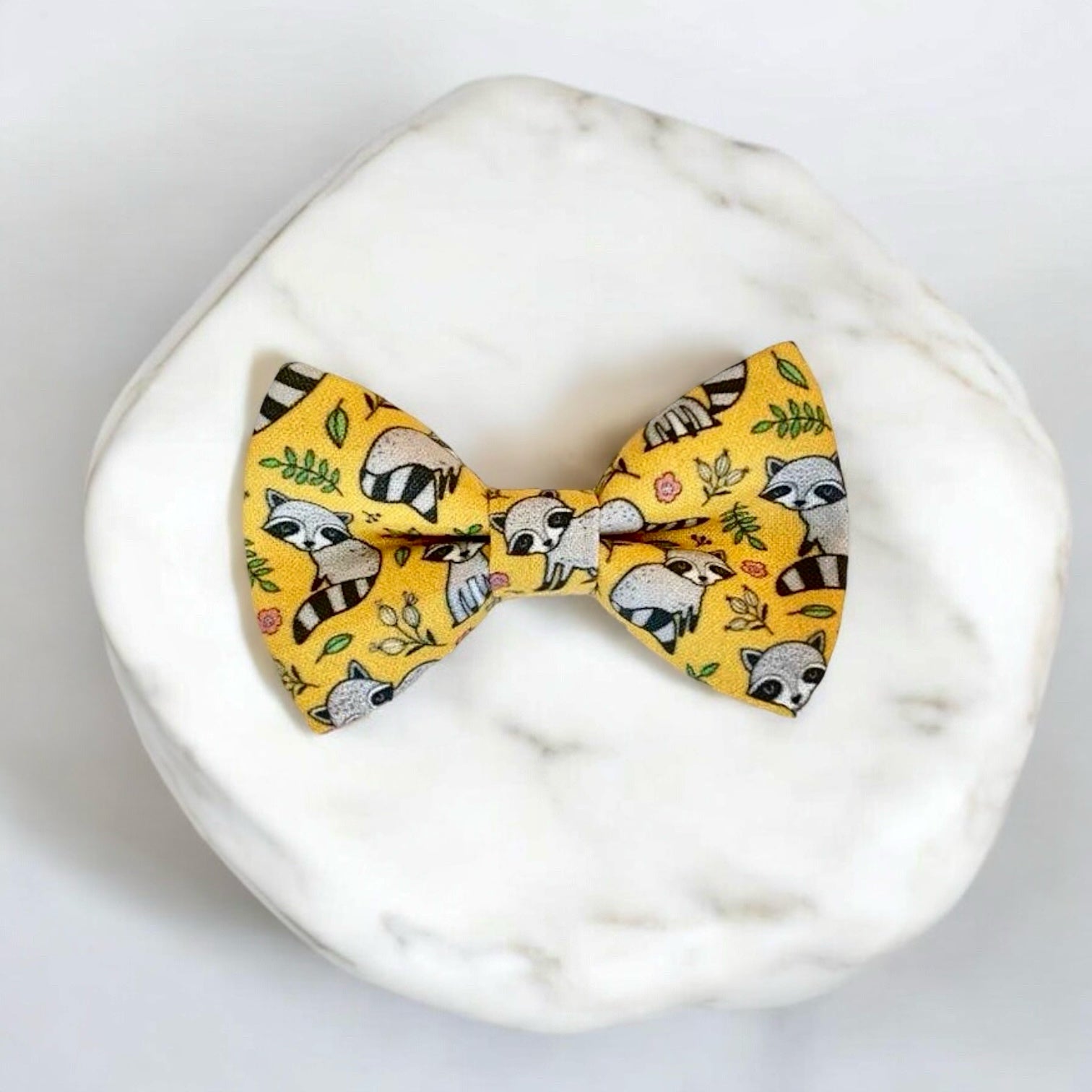 Mustard Yellow Raccoon Pet Bow Tie -- This dog bow tie slips easily on to a dog collar to help bring a little fun to the everyday!