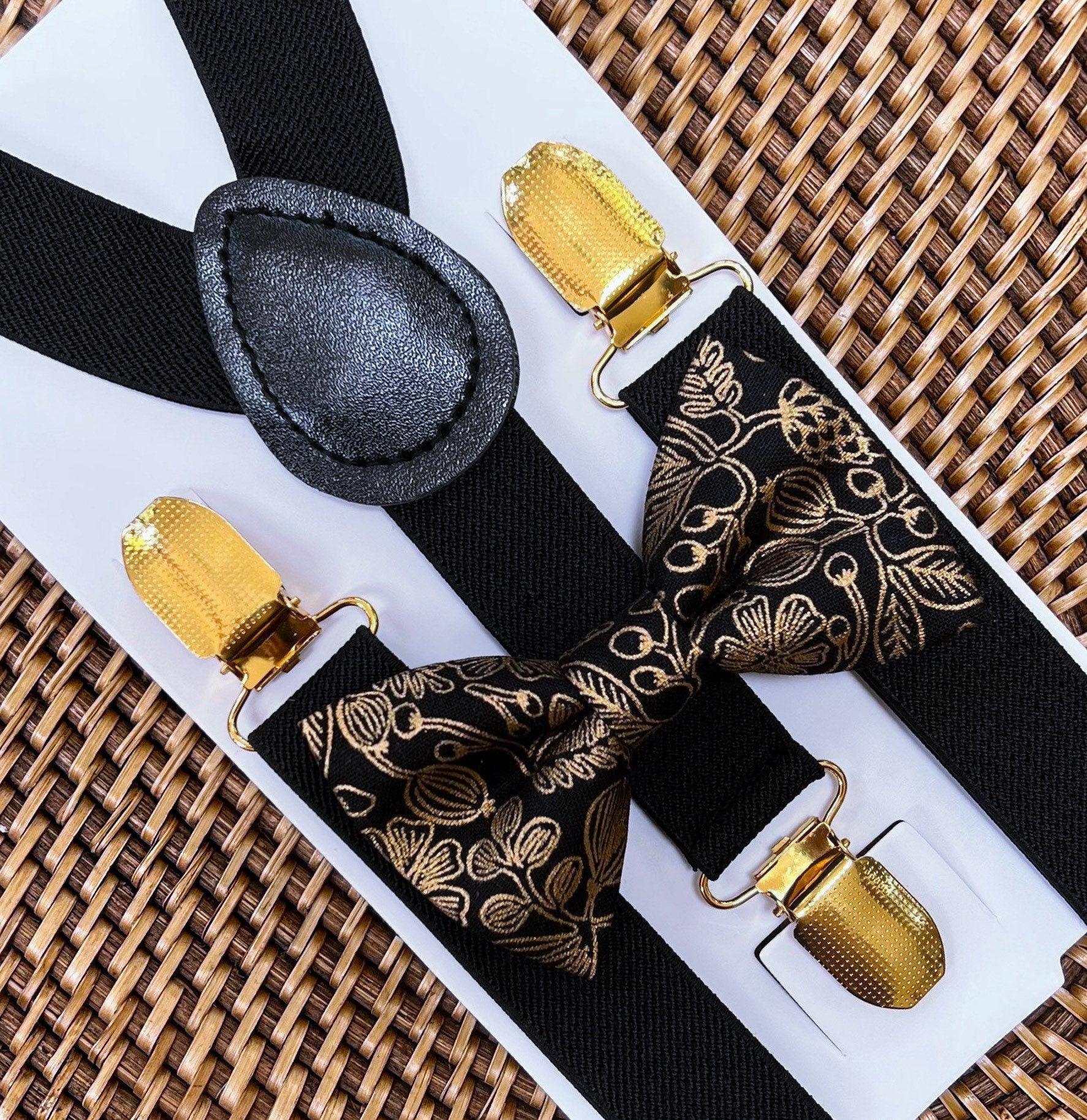 Black and Gold Bow Tie & Black Suspenders with Gold Clips- The Perfect Wedding Look! Our bow tie & suspenders are a great choice for family photos, wedding, ring bearer outfit, birthday celebration or any other special occasion.