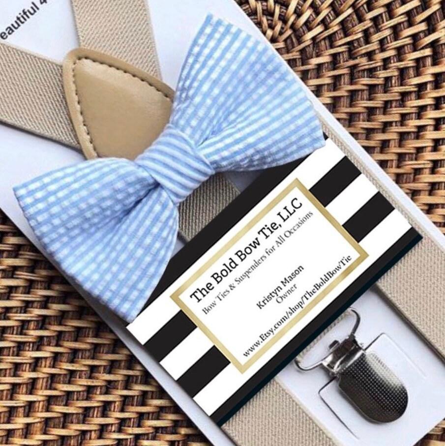 Our Light Blue Seersucker Bow Tie & Tan Suspenders Set is a great choice for a wedding, Easter outfit, groomsmen bowties, ring bearer outfit, birthday celebration or any other special occasion.