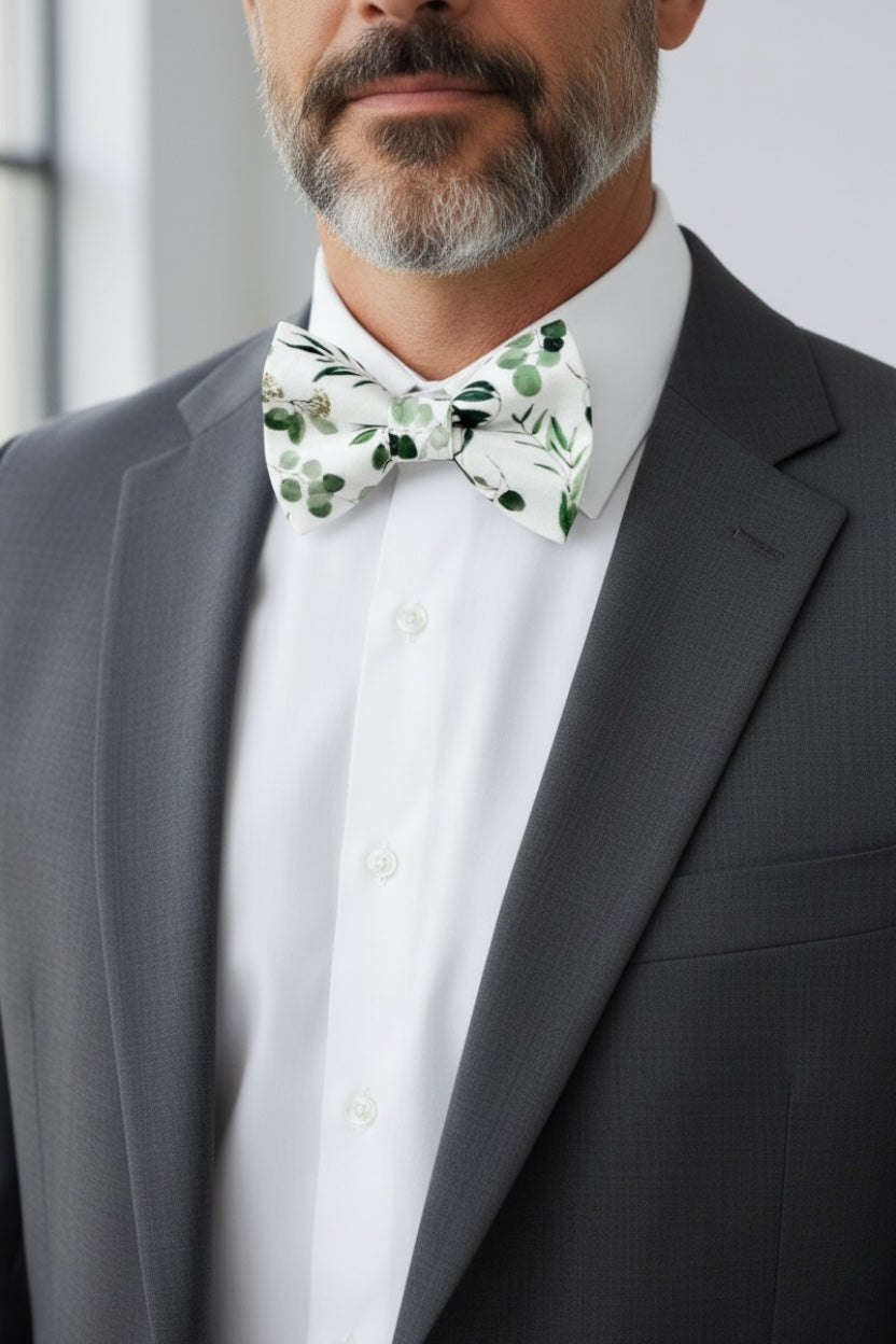 Elegant, earthy, and versatile, this Dark Green Floral Cotton Bow Tie adds a refined botanical touch to any wedding or formal outfit.