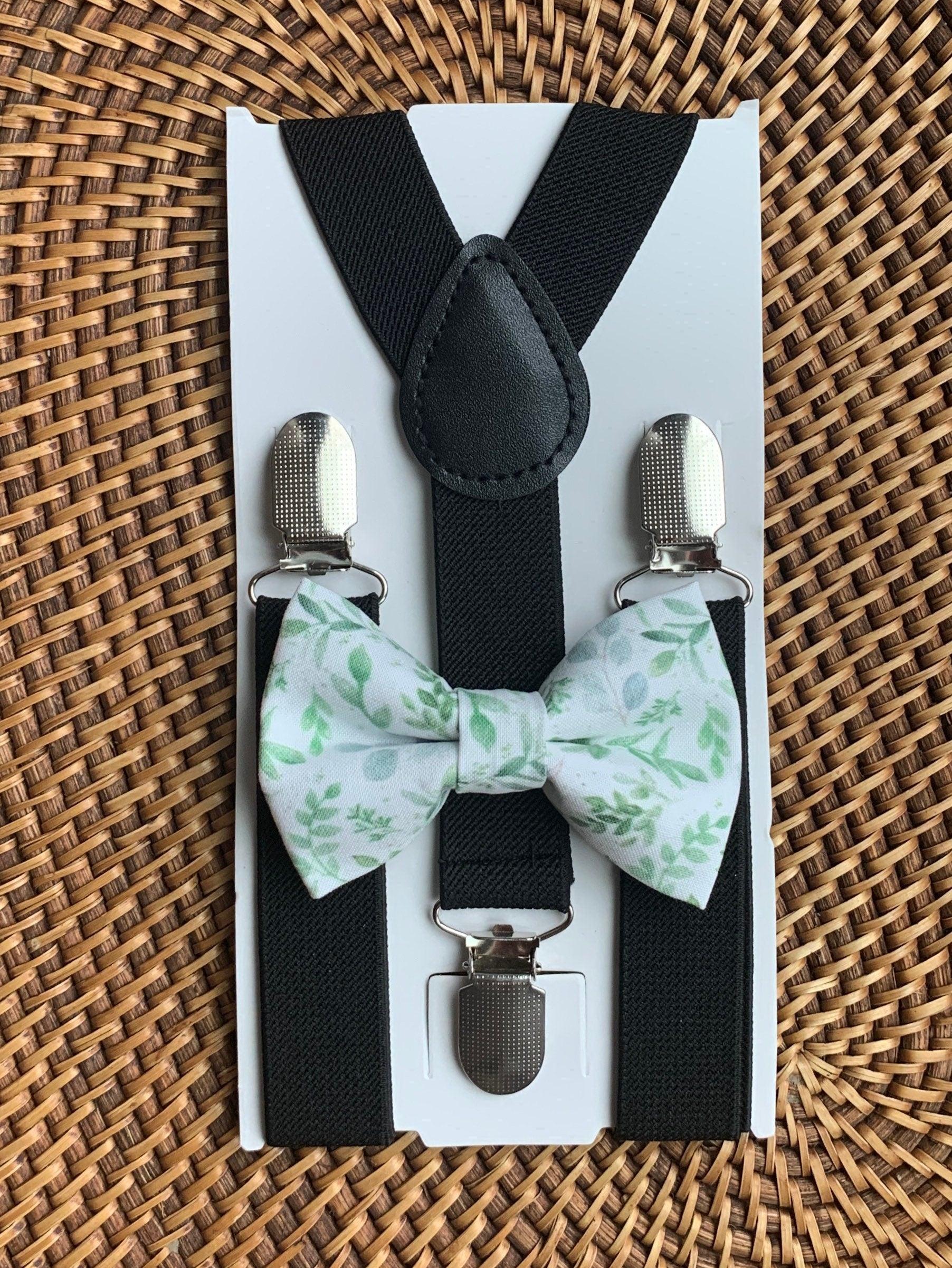 Your special guy will look so dashing when he shows up wearing this sage green floral bow tie and black suspenders set! This bow tie and suspender set is a great choice for family photos, wedding, ring bearer outfit, birthday celebration or any other special occasion.
