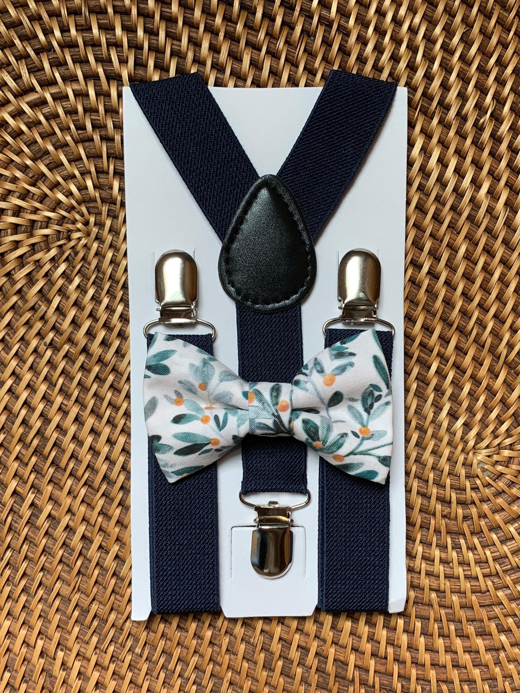 Your special guy will look so handsome when he shows up wearing this sage floral bow tie and navy suspenders! This floral bow tie & suspender set is a great choice for family photos, wedding, ring bearer outfit, birthday celebration or any other special occasion.