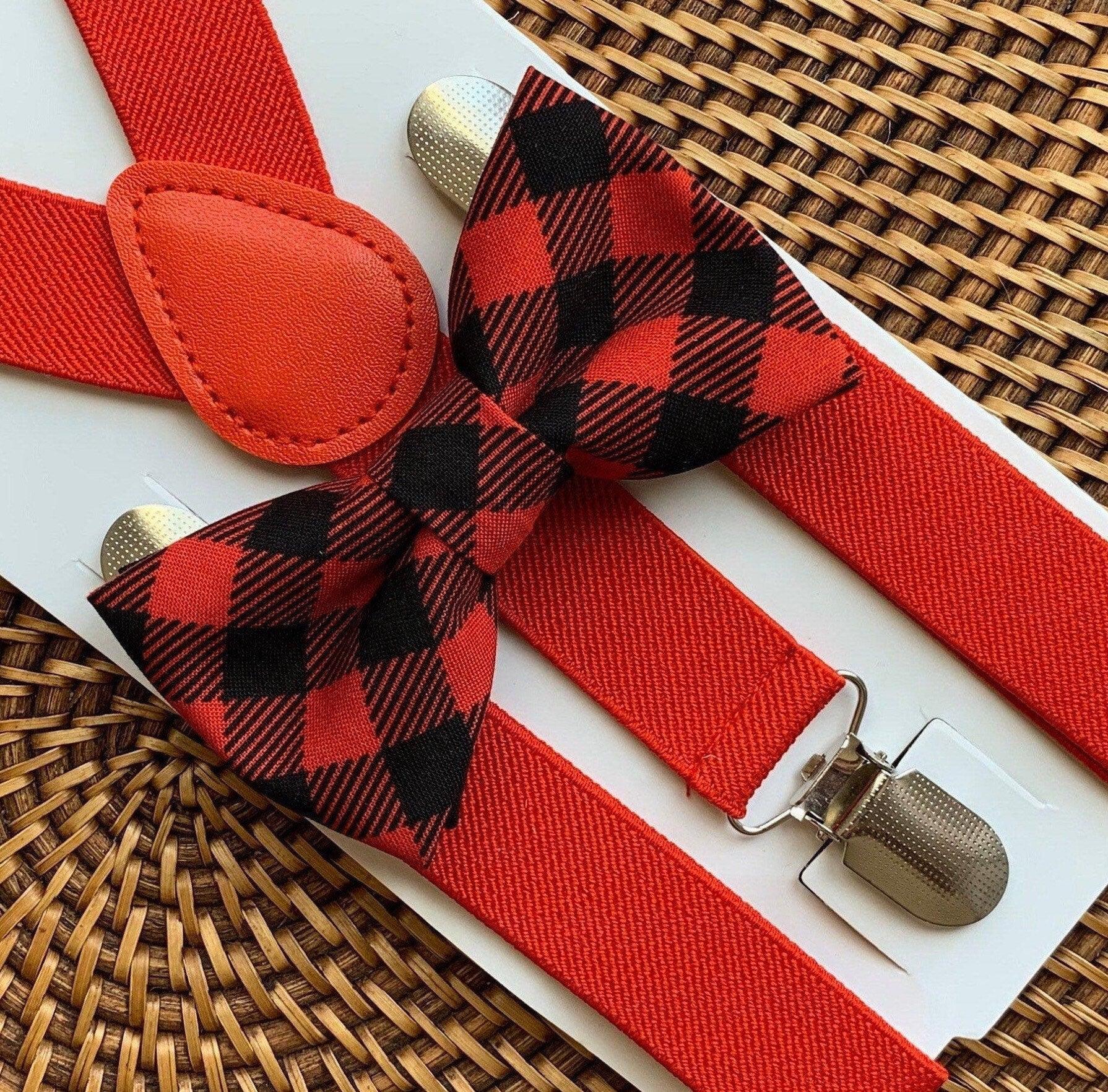 Buffalo plaid bow tie and red suspenders set for Christmas outfits, rustic weddings, holiday photos, winter celebrations, and ring bearer attire. This pre-tied red and black buffalo plaid bow tie with adjustable red suspenders is a best-selling holiday accessory set for boys and men, perfect for creating coordinated family Christmas outfits, lodge-themed celebrations, and rustic winter style. Whether for Christmas card photos, winter weddings, or festive gatherings, this set delivers classic lumberjack charm with timeless appeal.