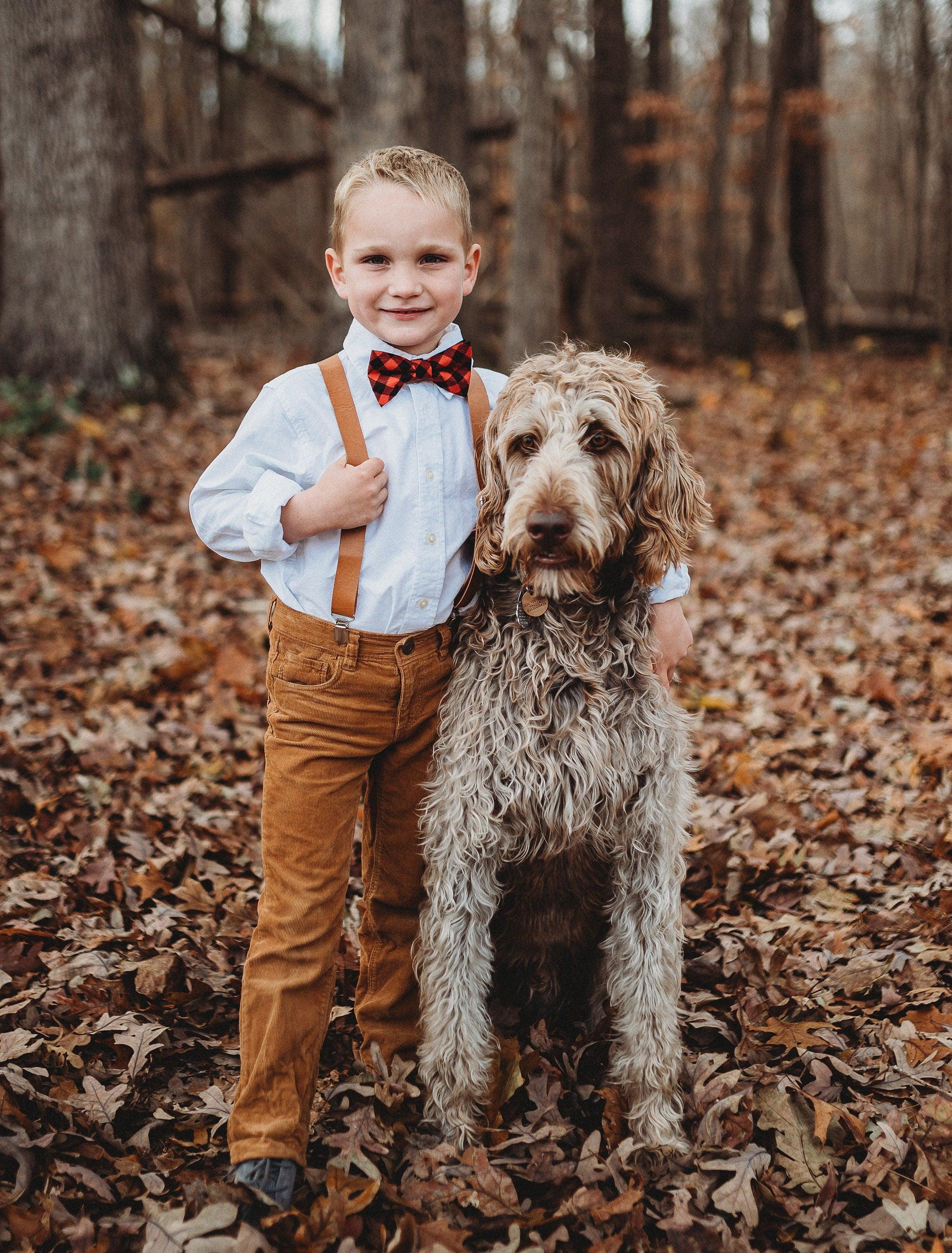Buffalo plaid bow tie and brown vegan leather suspenders set for rustic weddings, Christmas outfits, holiday photos, lumberjack parties, and ring bearer attire. This pre-tied red and black buffalo plaid bow tie with adjustable brown vegan leather suspenders is the perfect rustic formal accessory set for boys and men who want bold style with rugged charm. Whether for a country wedding, family Christmas pictures, cabin-themed celebration, or outdoor winter event, this set delivers timeless lodge-inspired style.