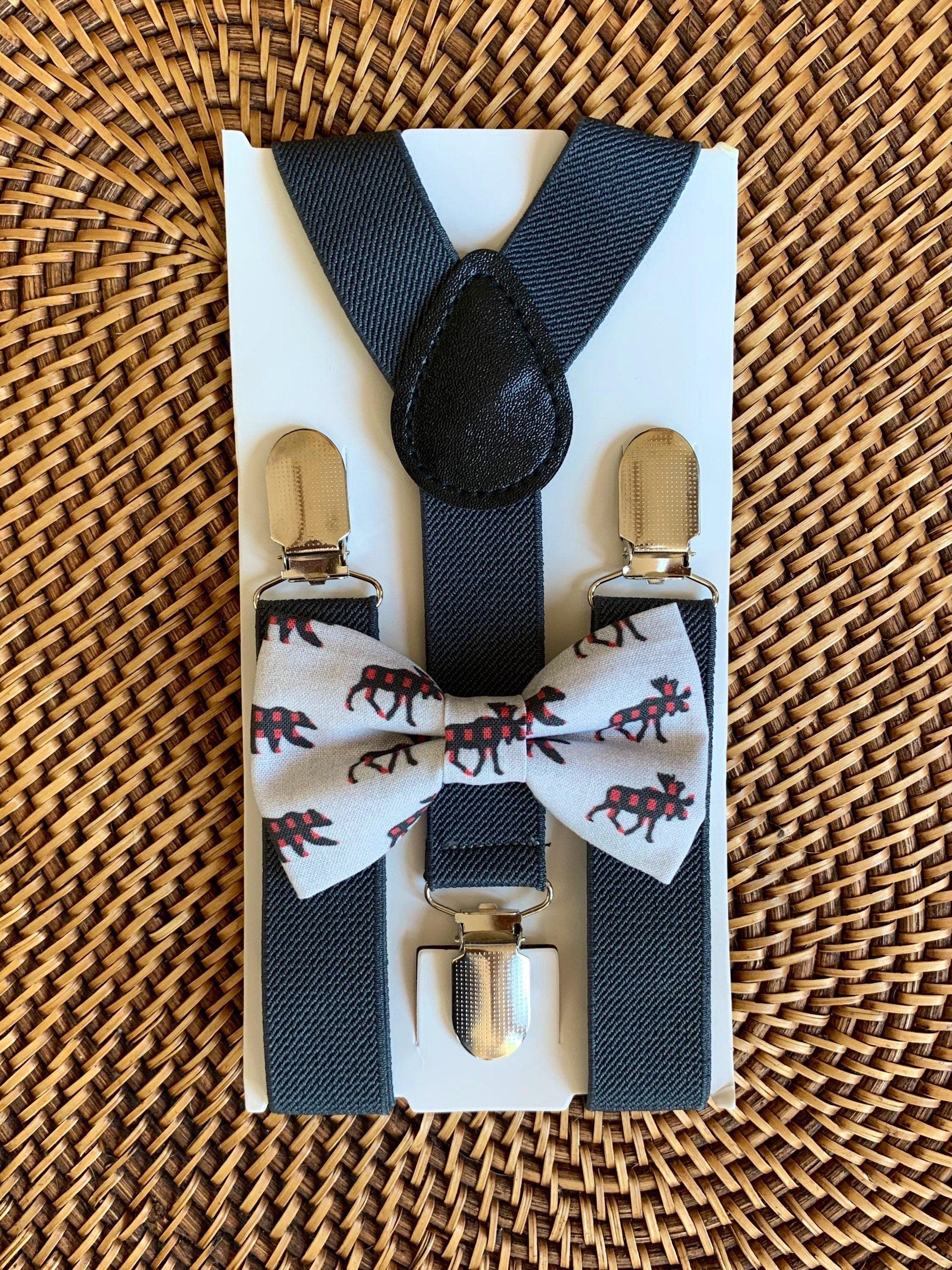 Buffalo Plaid Moose Bow Tie & Dark Grey Suspenders Set