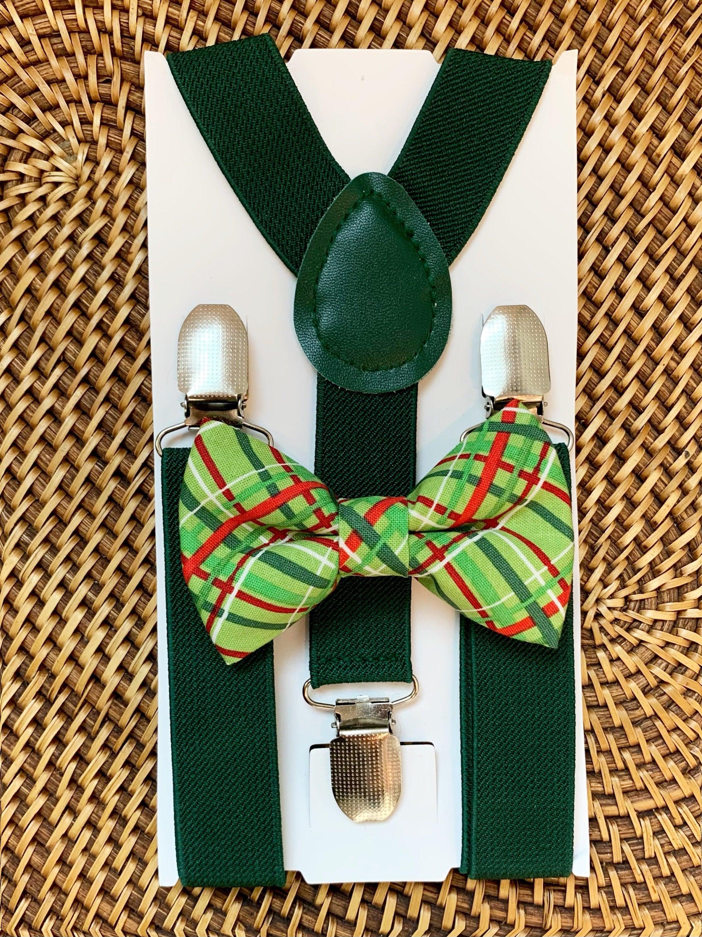 Red and green Christmas bow tie and suspenders set for holiday family photos, Christmas parties, school Christmas programs, winter weddings, and Santa visits. This pre-tied red and green Christmas bow tie with matching suspenders is a classic holiday dress accessory for boys and men, perfect for matching family Christmas outfits, festive ring bearer attire, and coordinated sibling or father and son looks. Designed with traditional Christmas colors, this set delivers timeless holiday charm for the entire season.