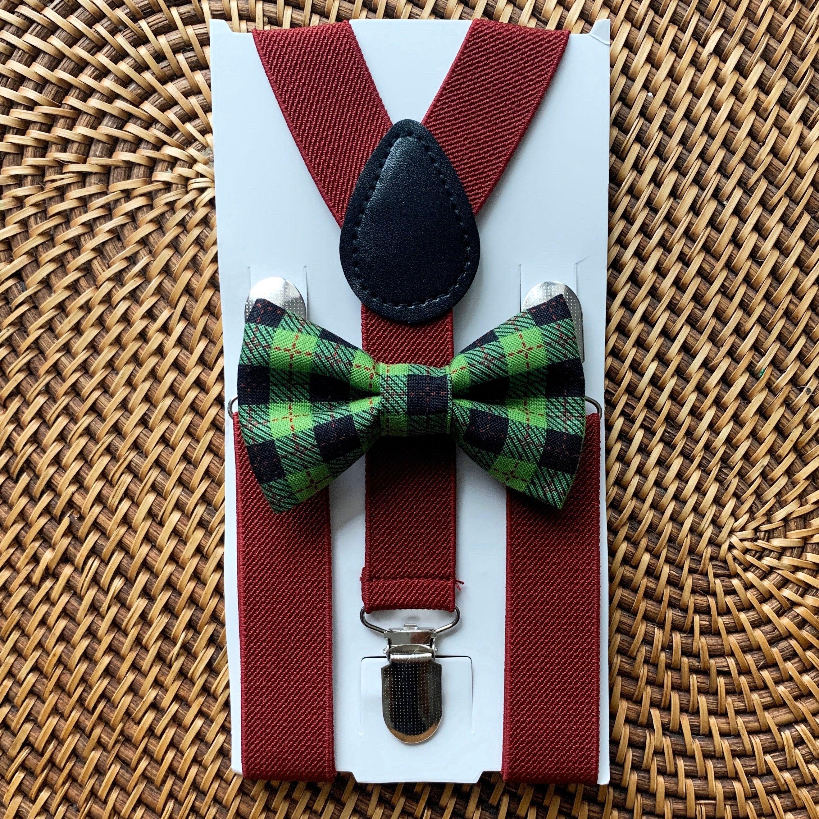 Green Plaid Bow Tie & Burgundy Suspenders Set - Perfect for the Holidays!