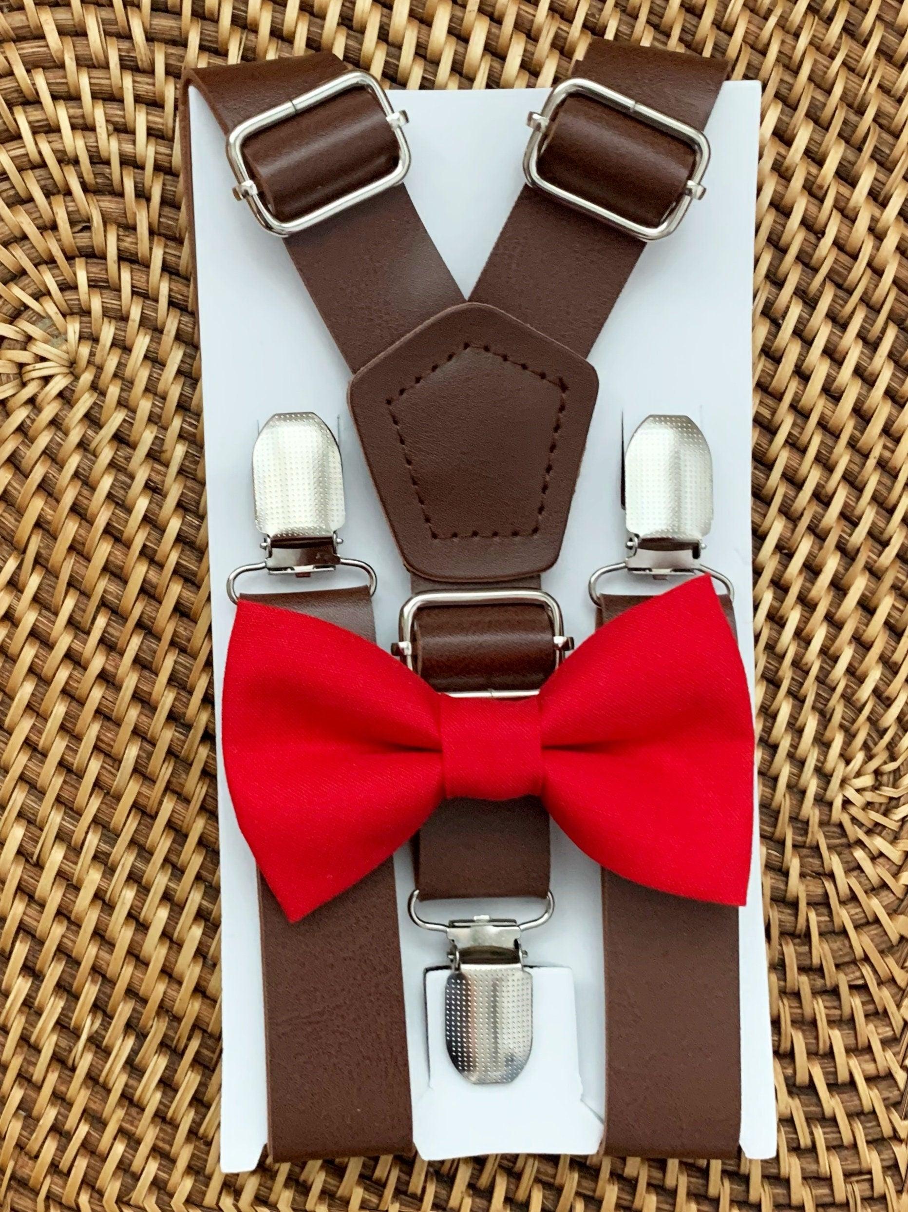 Red bow tie and dark brown vegan leather suspenders set for weddings, groomsmen, Christmas outfits, Valentine’s Day events, prom, graduations, and ring bearer attire. This pre-tied red bow tie with dark brown vegan leather suspendersis a bold and stylish formal accessory set for men and boys, perfect for adding classic sophistication to any outfit. Ideal for rustic weddings, barn weddings, holiday celebrations, and family photo sessions, this set combines vibrant color with timeless Western-inspired style.