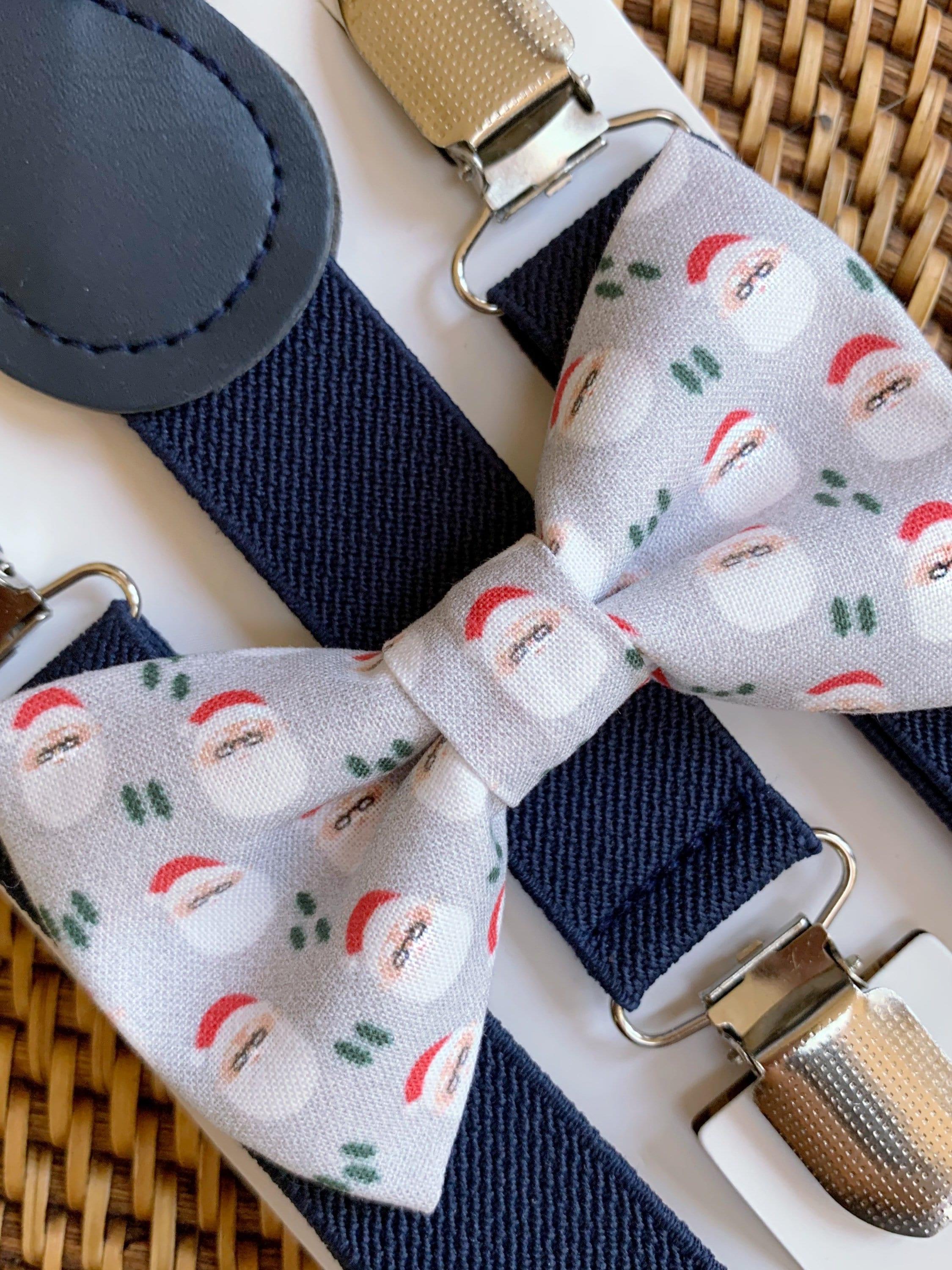 Festive, fun, and picture-perfect, this Santa Bow Tie and Navy Suspenders Set is the ultimate Christmas accessory set for creating joyful holiday style.