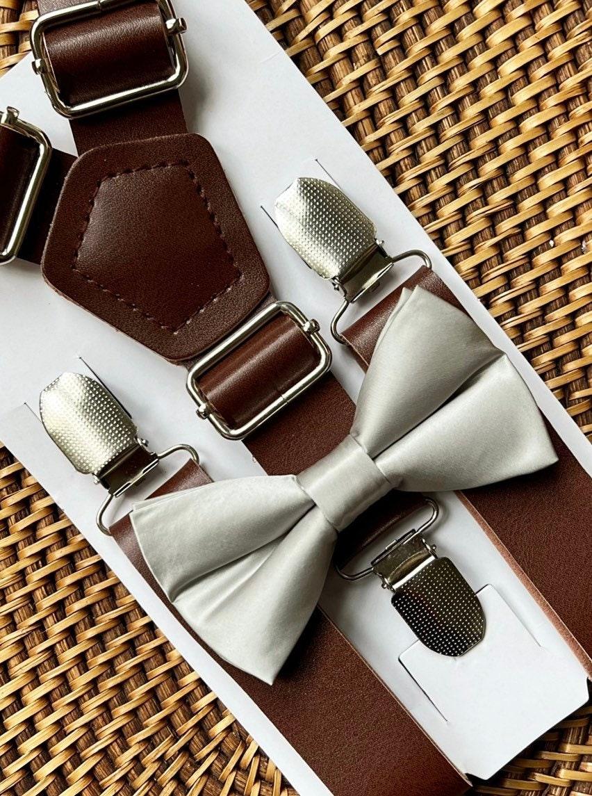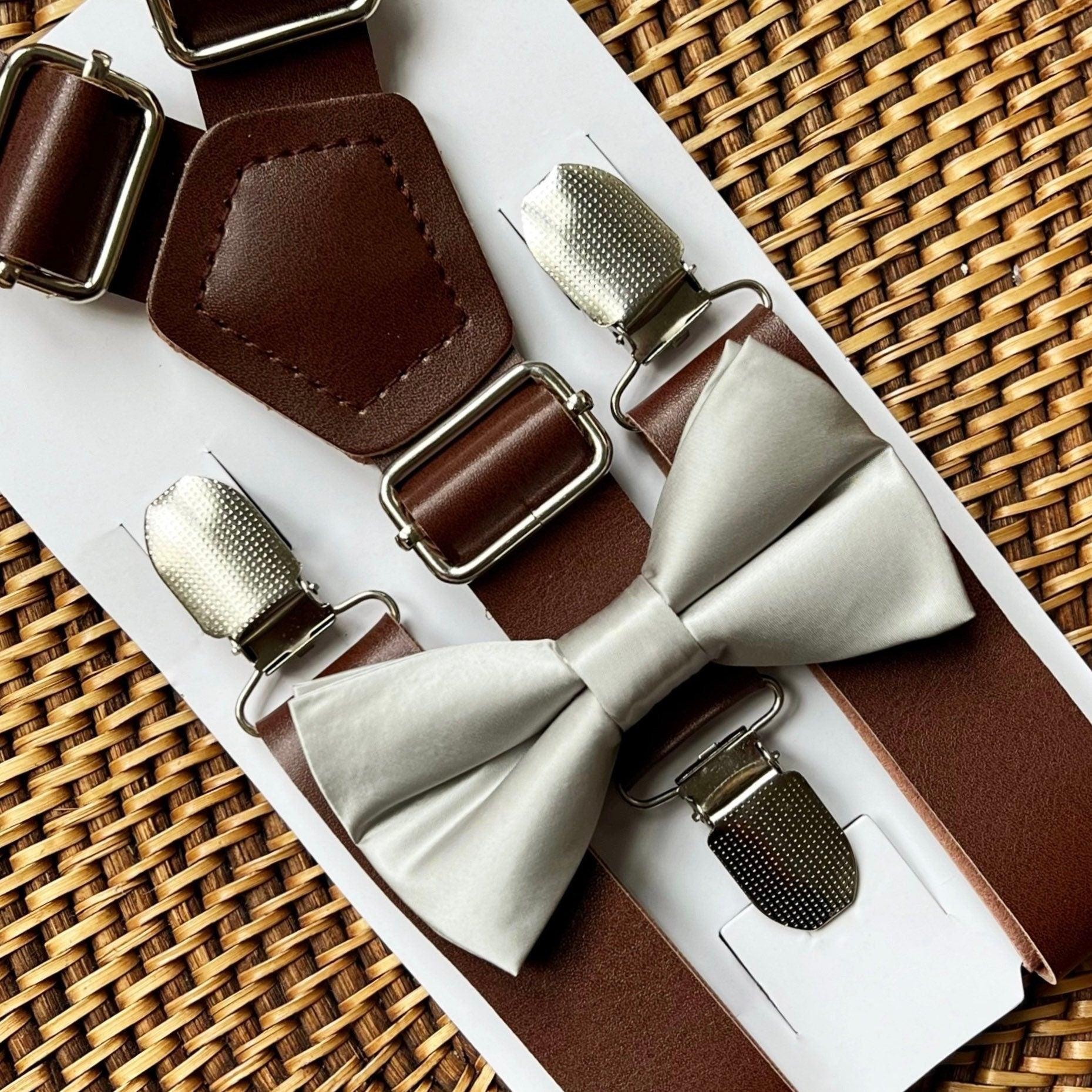 Silver Satin Bow Tie & Dark Brown Vegan Leather Suspenders Set- Your guy will look so dashing when he shows up wearing this satin silver bow tie and faux leather suspenders set! This bow tie set is a great choice for family photos, wedding, groomsmen, ring bearer outfit, birthday celebration or any other special occasion.