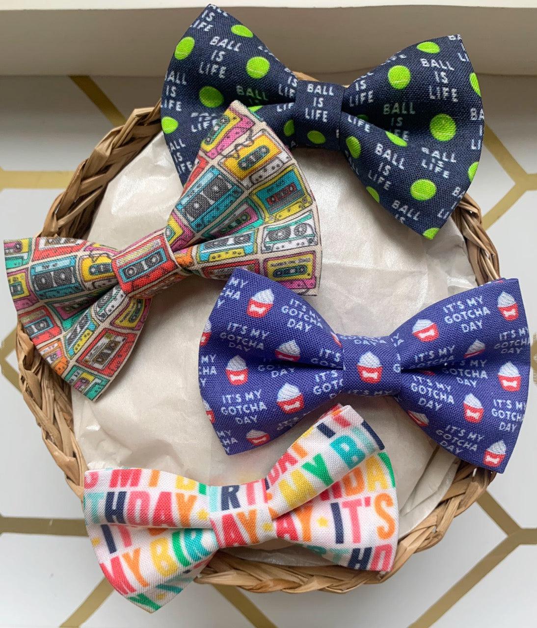 This is the perfect dog lover gift or cat lover gift! We have personally curated this selection of pet bow ties from our best sellers and fan favorites. The elastic loops on the back allow you to comfortably and conveniently slide the bows onto your dog collar or cat collar.
