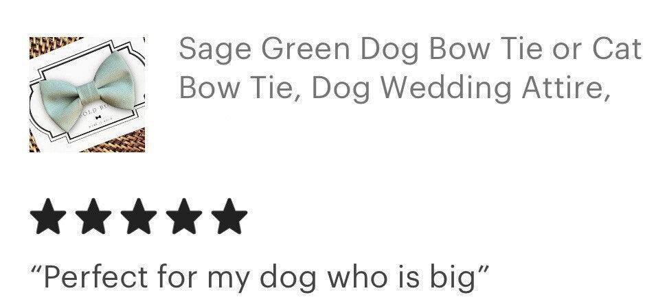 Our sage green dog bow tie or cat bow tie attaches easily to a dog collar or cat collar with elastic. This is PERFECT for a sage dog tuxedo for a sage wedding, dog wedding attire, dog wedding bow tie, dog ring bearer, new puppy gift, dog mom gift, dog accessories, pet accessories, dog wedding, or any other special occasion!