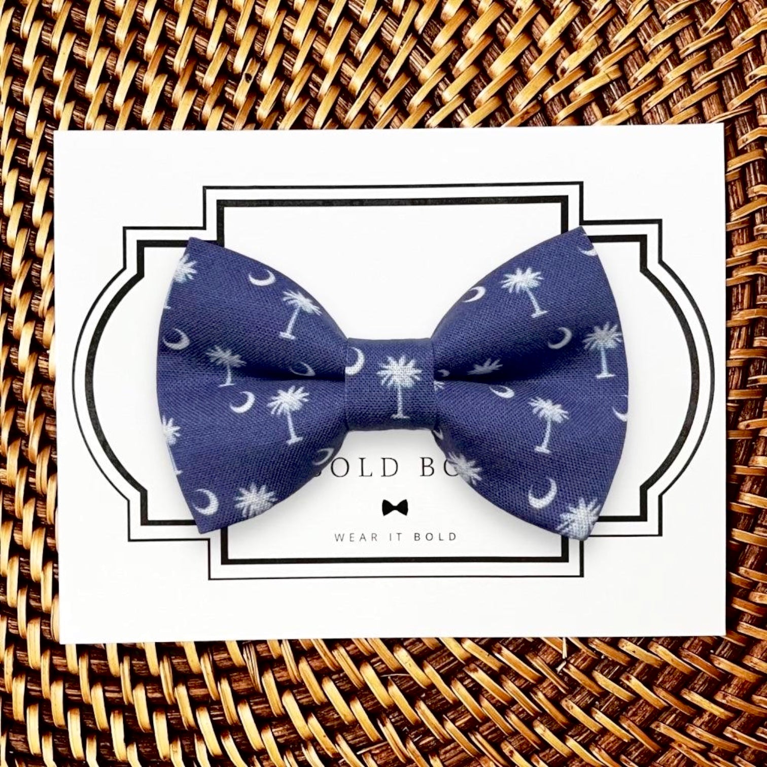 South Carolina dog bow tie or cat bow tie easily slips on a dog collar or cat collar with elastic! This bowtie features a palm tree and moon, the icons found on the South Carolina state flag. It is perfect for a dog gift, bow tie for dogs, dog accessories, dog lover gift, cat gift, or any other special occasion!