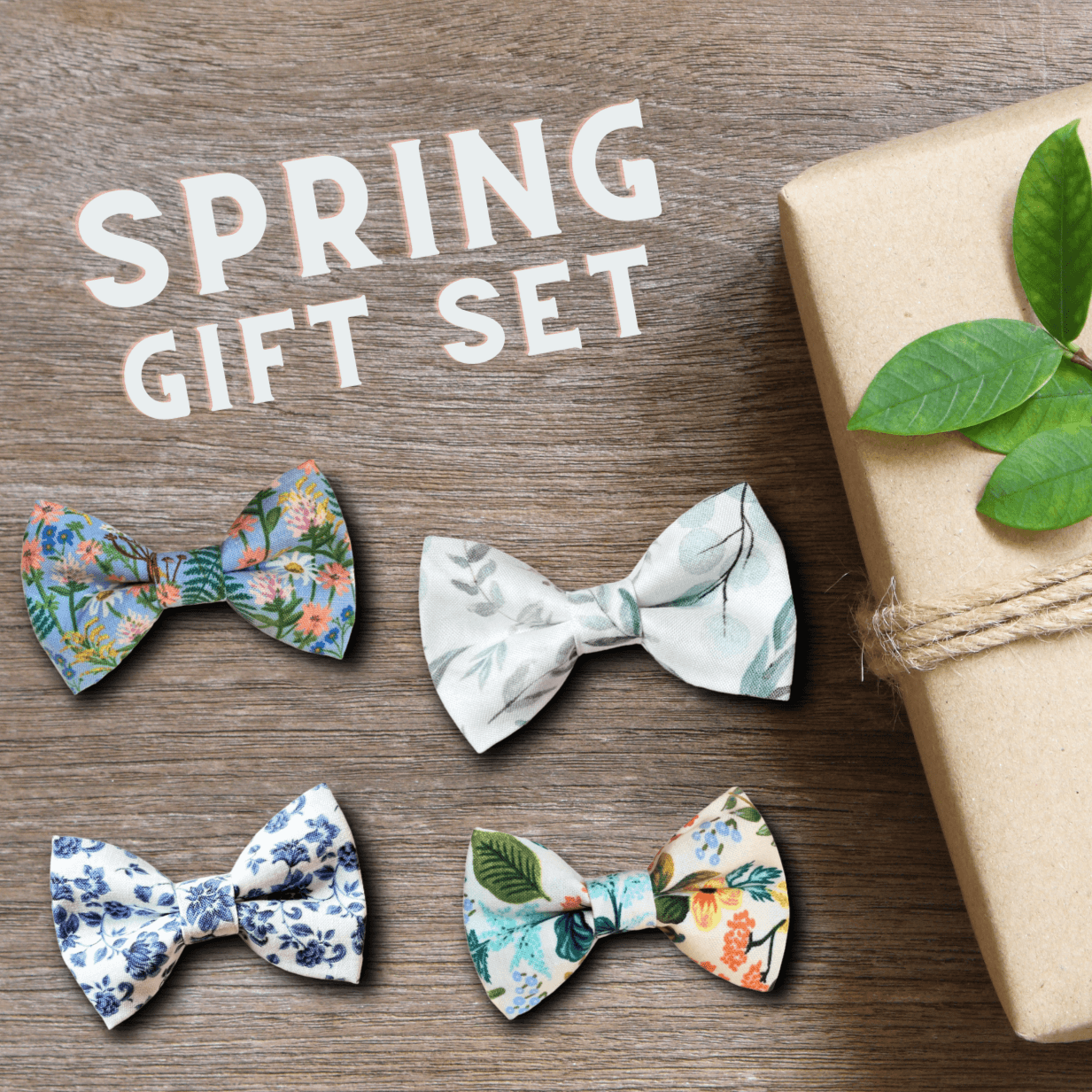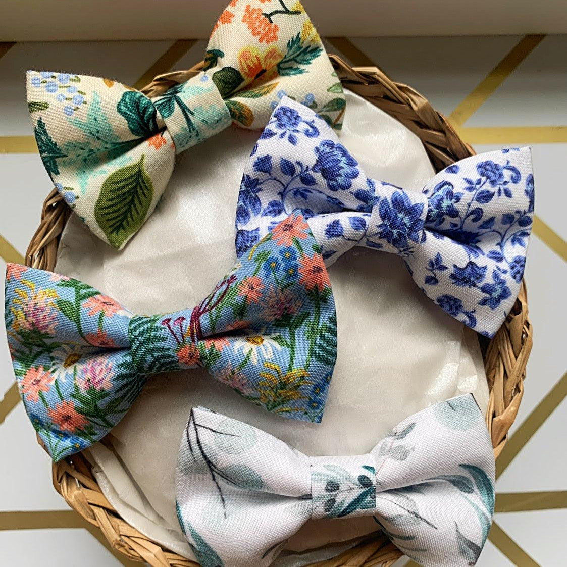 Our Dog & Cat Bow Ties Collection features stylish, handmade pet bow ties designed to slide easily onto any dog collar or cat collar with elastic. Perfect for dog weddings, ring bearer pets, engagement photos, birthday parties, holidays, family portraits, and everyday style, these bow ties make pets look their very best. From classic solids and rustic plaids to seasonal designs and floral prints, each dog bow tie and cat bow tie is crafted with premium fabrics for durability and comfort. A thoughtful dog lover gift, cat lover gift, or new puppy gift, these premium pet bow ties are proudly handmade in the USA by a woman-owned, family-run brand, combining wedding-ready elegance with everyday charm.