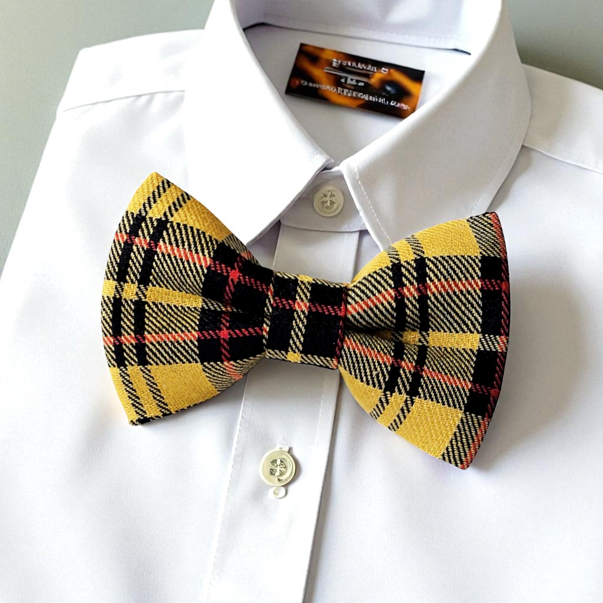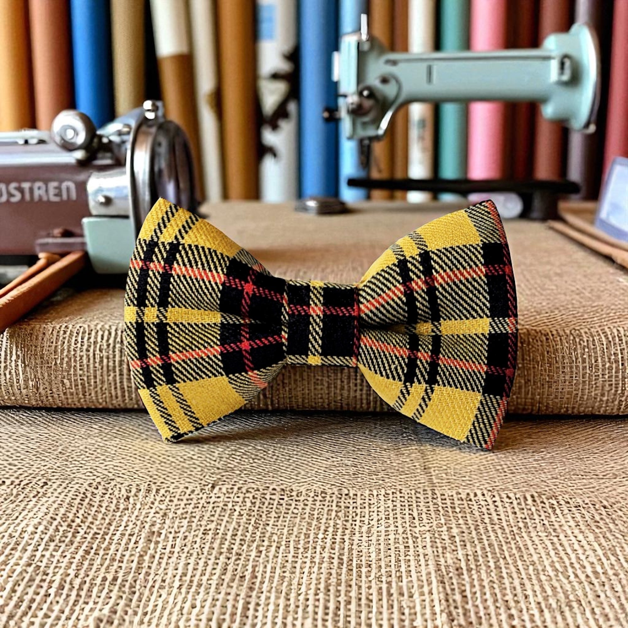 Mustard Yellow Plaid Bow Tie: Our Bow Ties are handmade and pre-tied. They come with an adjustable strap adhered that secures around the neck under the shirt collar.