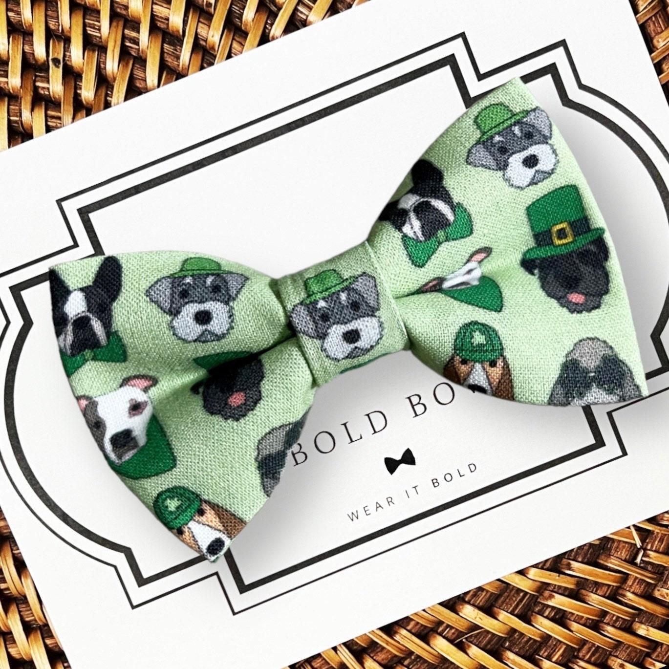 This St Patricks Day dog bow tie or cat bow tie slips easily on to a dog collar or cat collar with elastic. It is perfect for an Irish dog bow tie, dog lover green Saint Patricks dog accessories, pet lover dog bowtie, dog bows, cat or dog gift, or for any other special occasion!