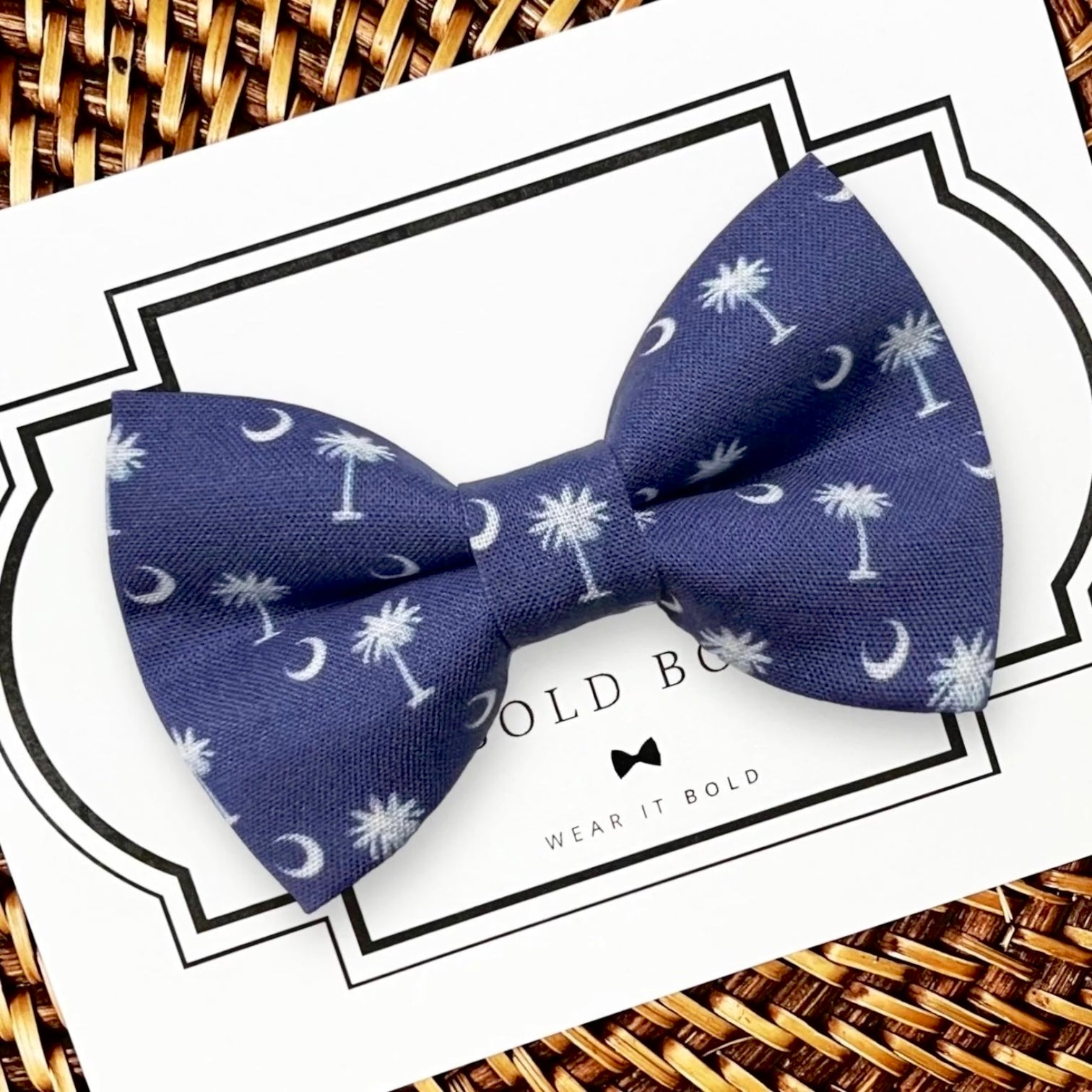 South Carolina dog bow tie or cat bow tie easily slips on a dog collar or cat collar with elastic! This bowtie features a palm tree and moon, the icons found on the South Carolina state flag. It is perfect for a dog gift, bow tie for dogs, dog accessories, dog lover gift, cat gift, or any other special occasion!