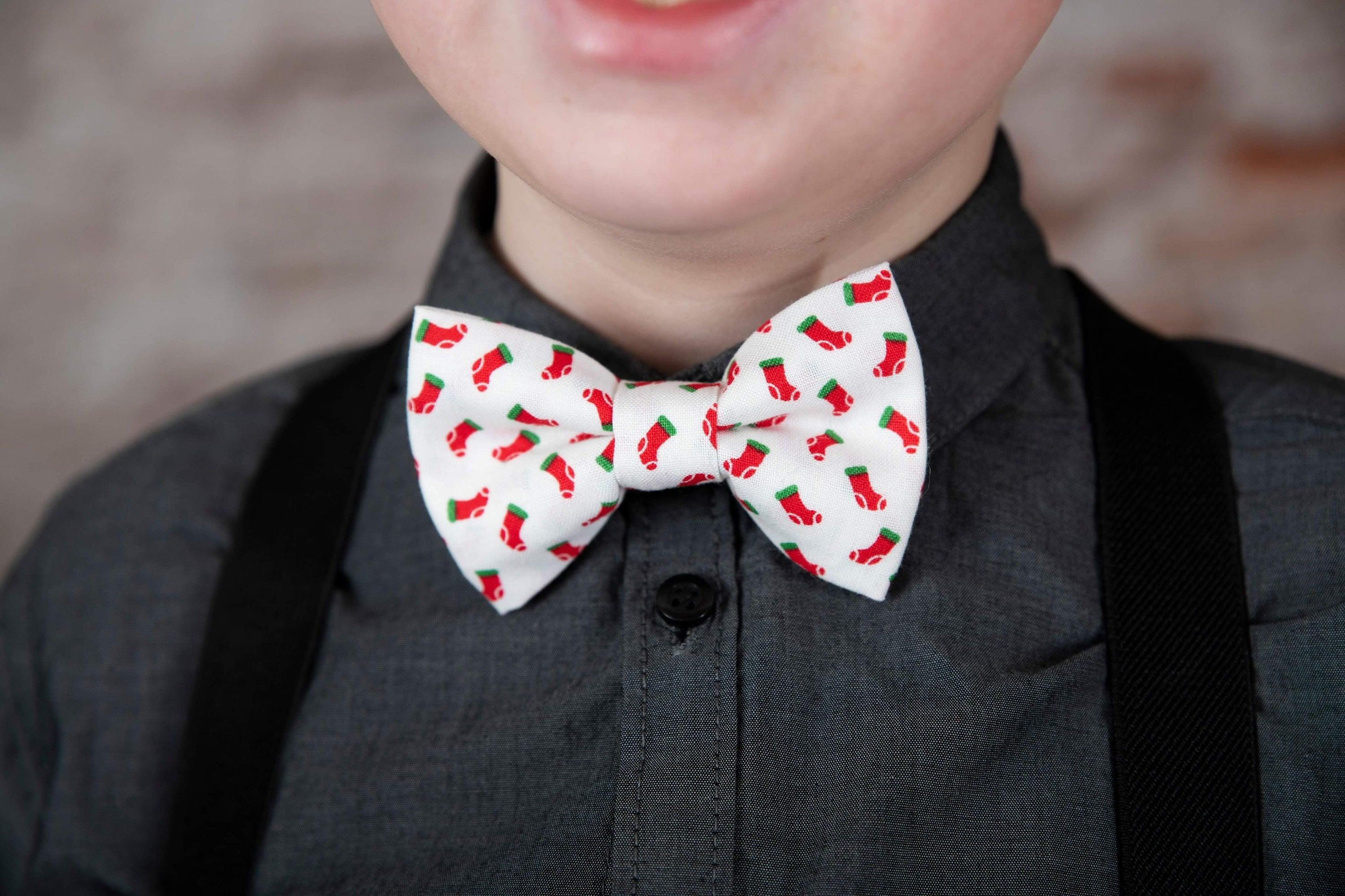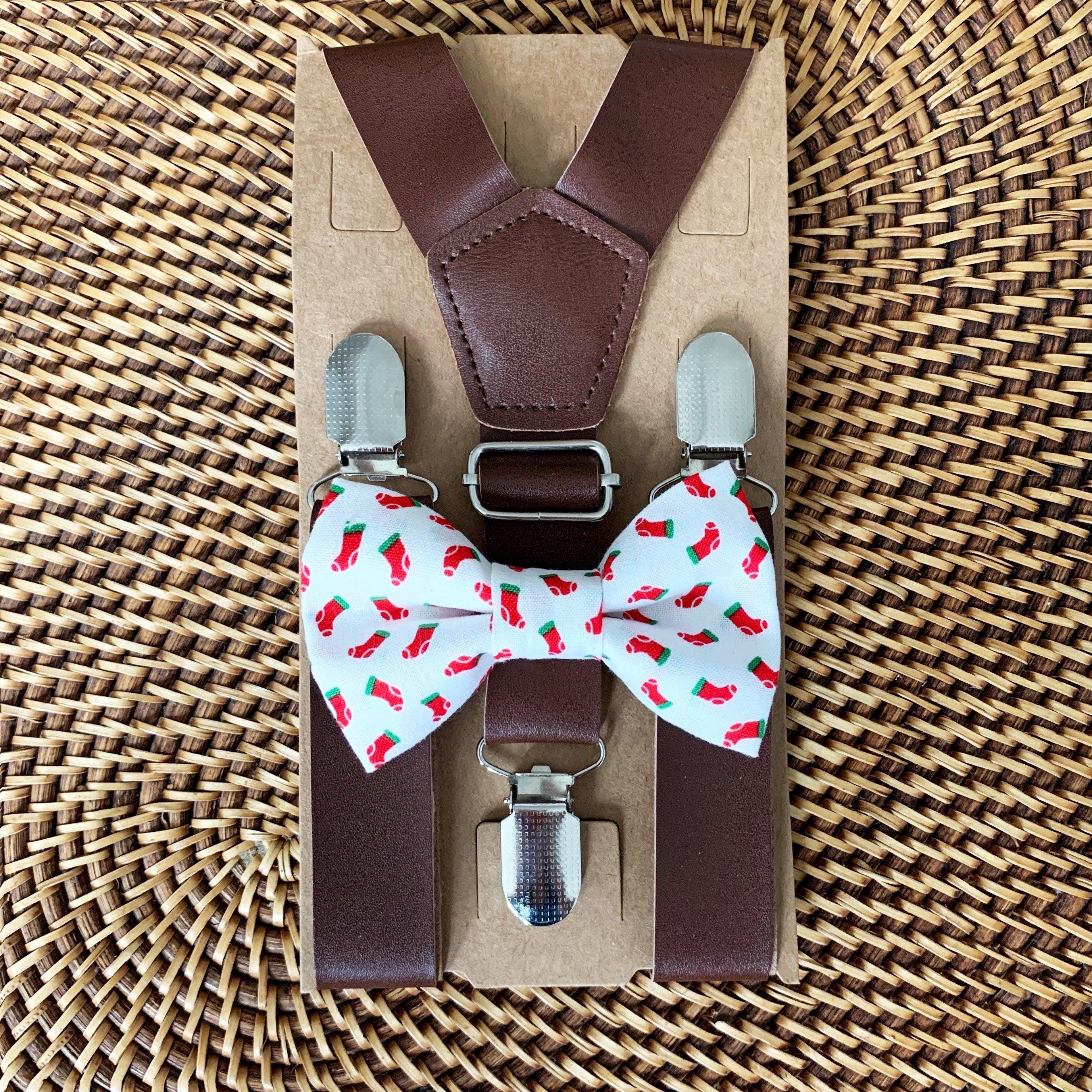Christmas Stocking Bow Tie & Dark Brown Vegan Leather Suspenders Set- Your special guy will look so handsome when he shows up wearing this Christmas bow tie and brown faux leather suspenders! The set is a great choice for family photos, Christmas outfit, wedding, ring bearer outfit, birthday celebration or any other special occasion.