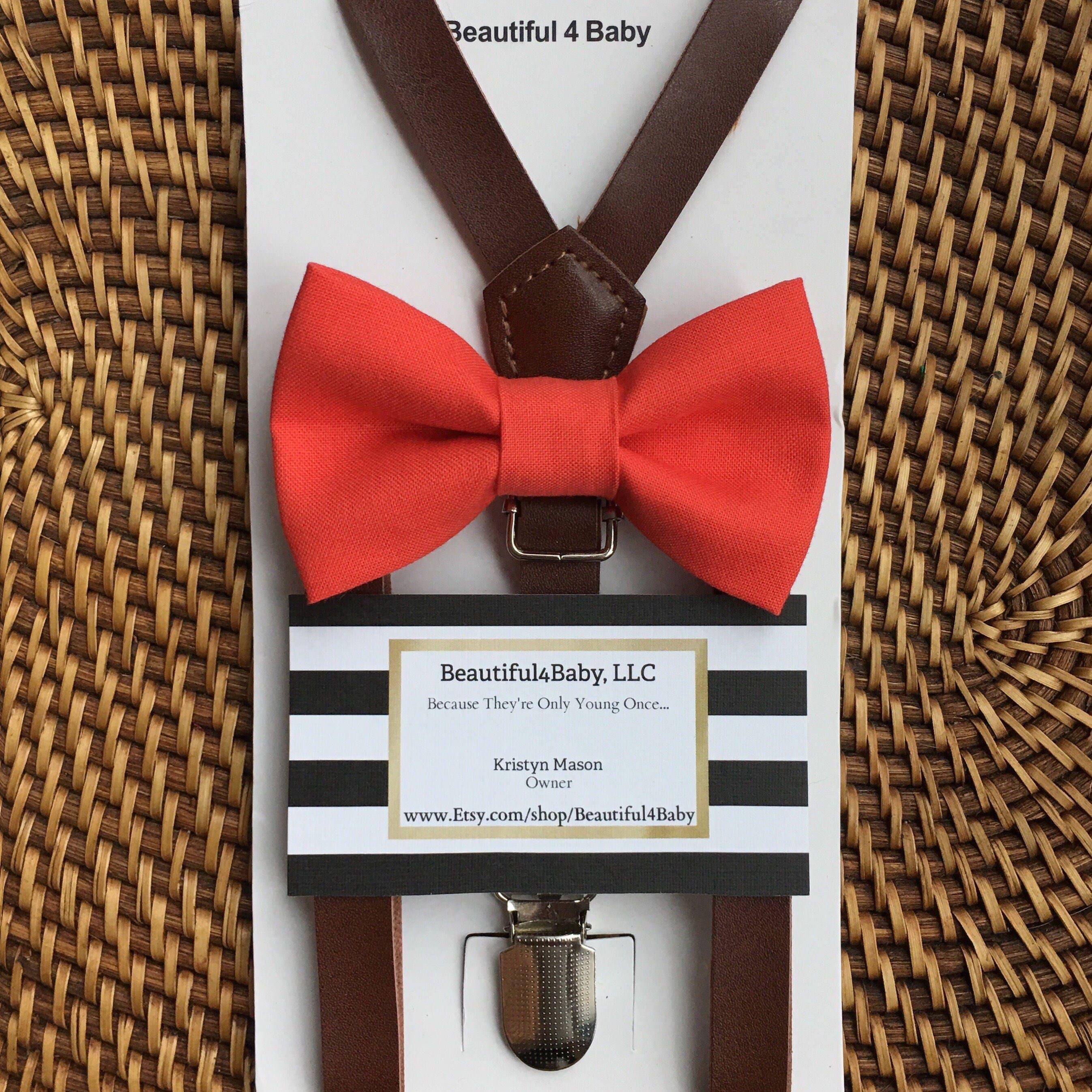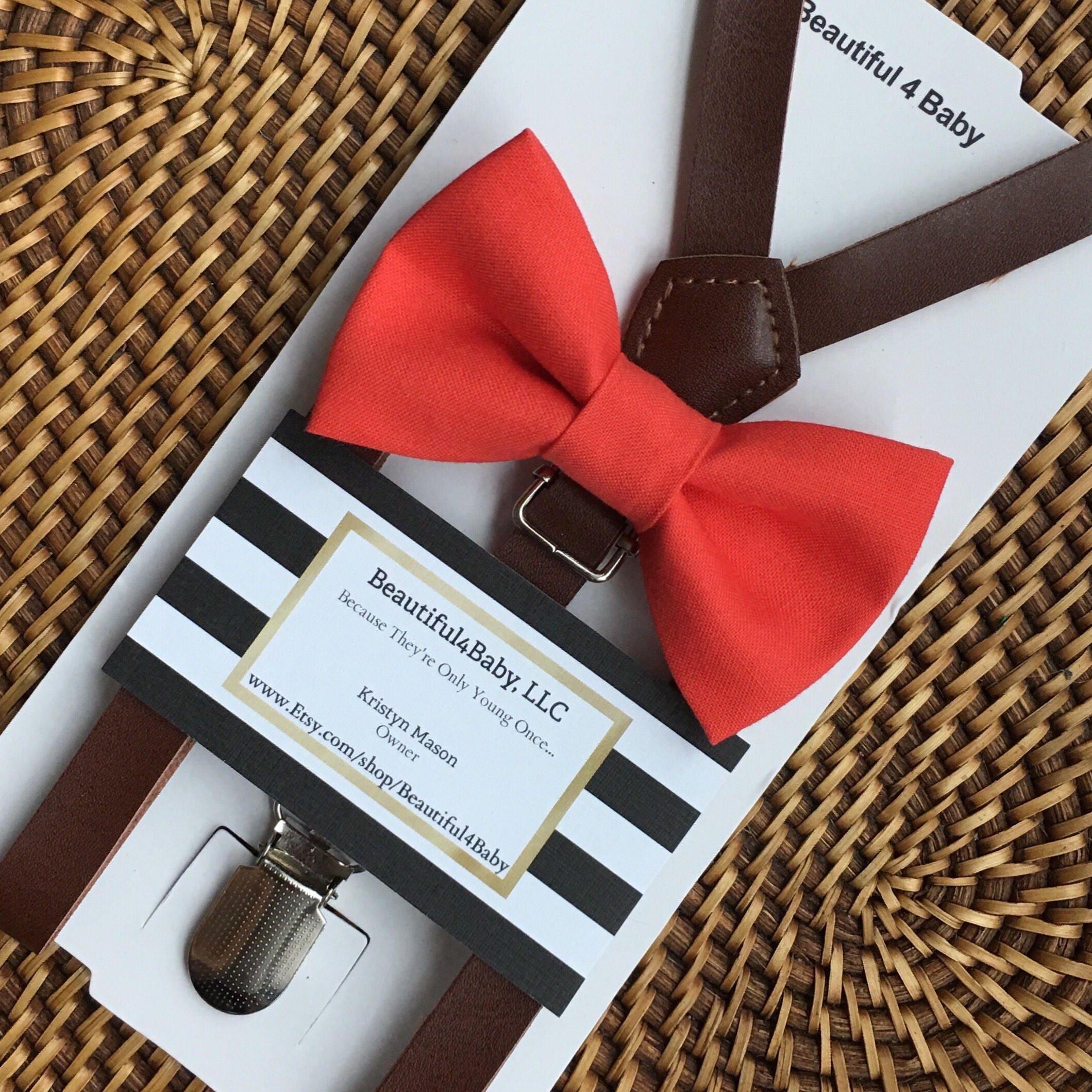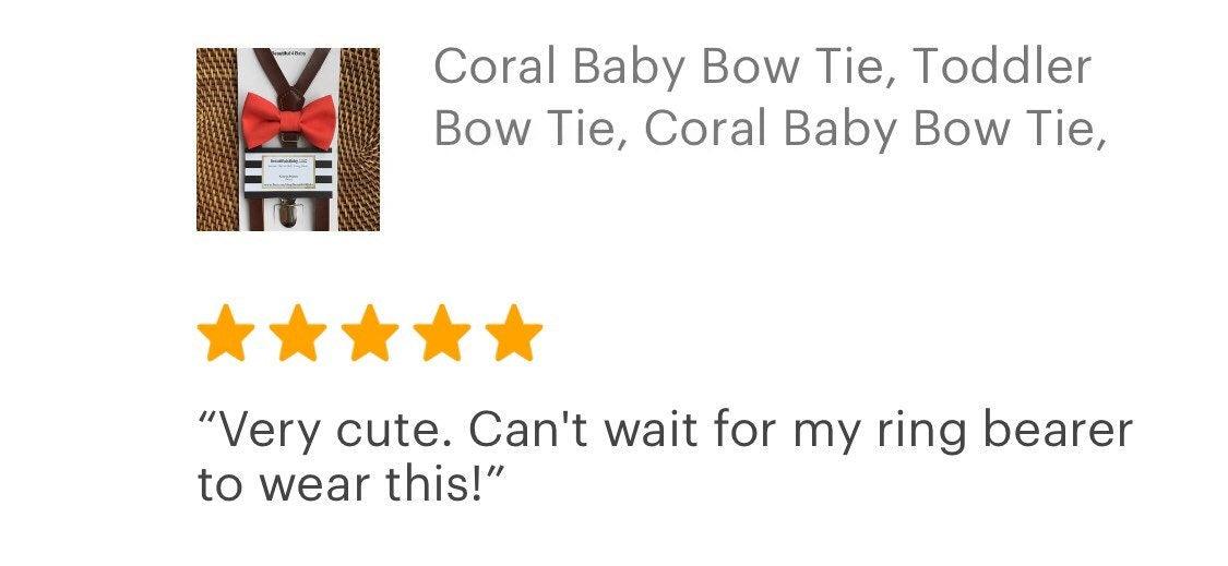 Your special guy will look so dashing when he shows up wearing this coral bow tie and faux leather suspenders set! Our coral bow tie is a great choice for family photos, wedding, ring bearer outfit, birthday celebration or any other special occasion.