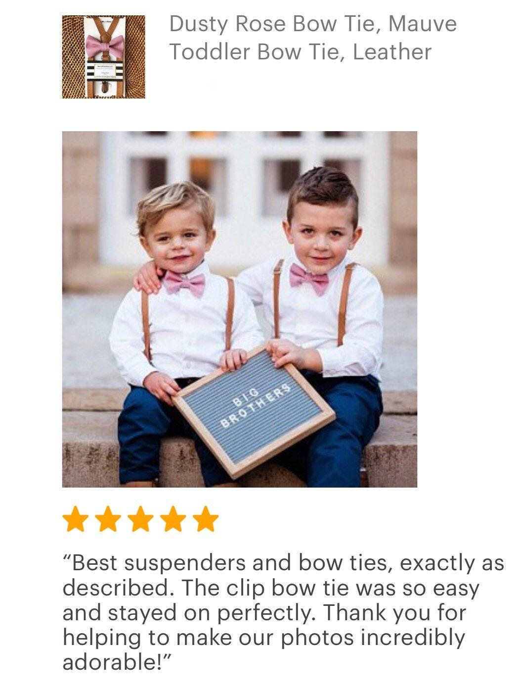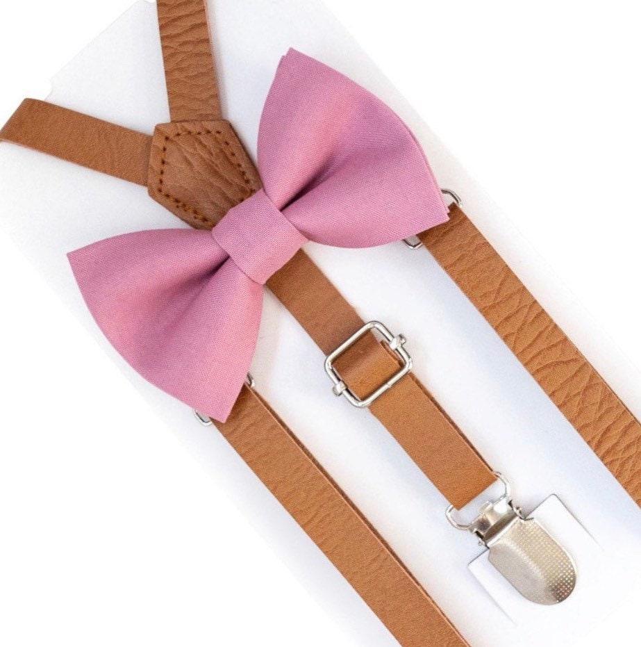 Dusty Rose Bow Tie & Tan Vegan Leather Suspenders Set- Your special guy will look so dashing when he shows up wearing this mauve bow tie and faux leather suspenders set! Our dusty rose bow tie is a great choice for family photos, wedding, ring bearer outfit, birthday celebration or any other special occasion.