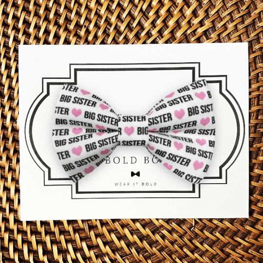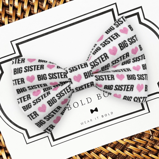 Big Sister dog bow tie or cat bow tie slips easily onto a dog collar or cat collar with elastic to help them look their best! It is the perfect dog lover gift, dog bowtie, pregnancy announcement gift, and gotcha day gift for your dog who is getting a new brother or sister!