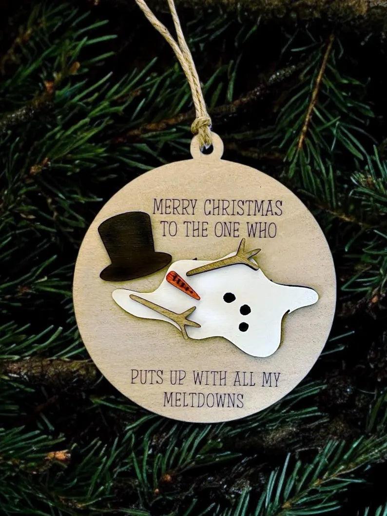 - Features the phrase "Merry Christmas to the One Who Puts Up With All My Meldowns"