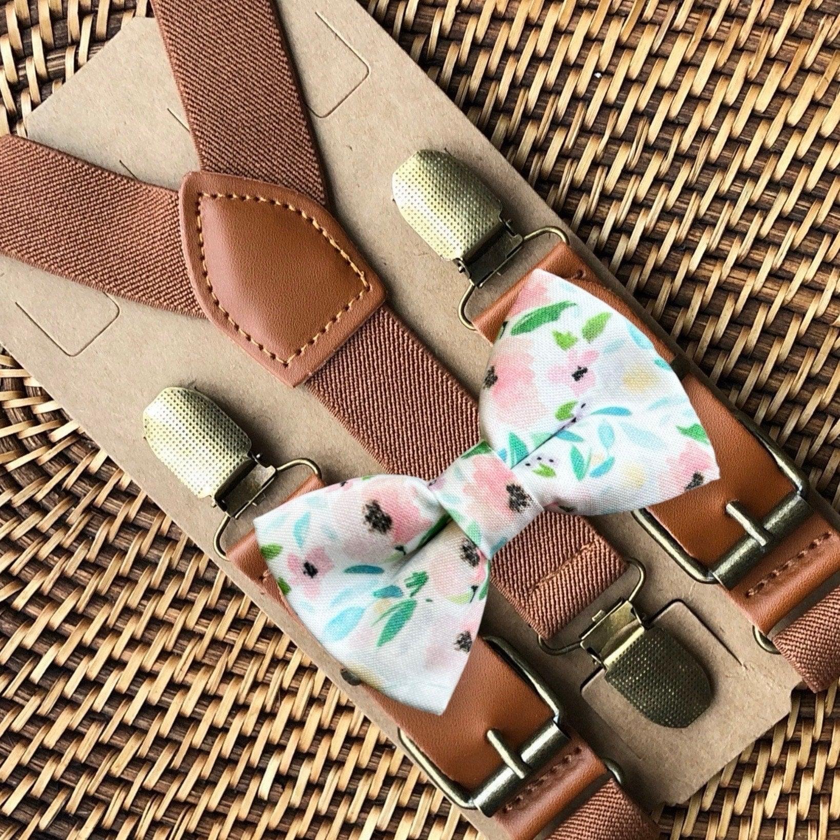 This floral bow tie & vegan leather brown suspenders set is a great choice for family photos, blue bow tie, groomsmen gift, weddings, ring bearer outfit, birthday celebration or any other special occasion.