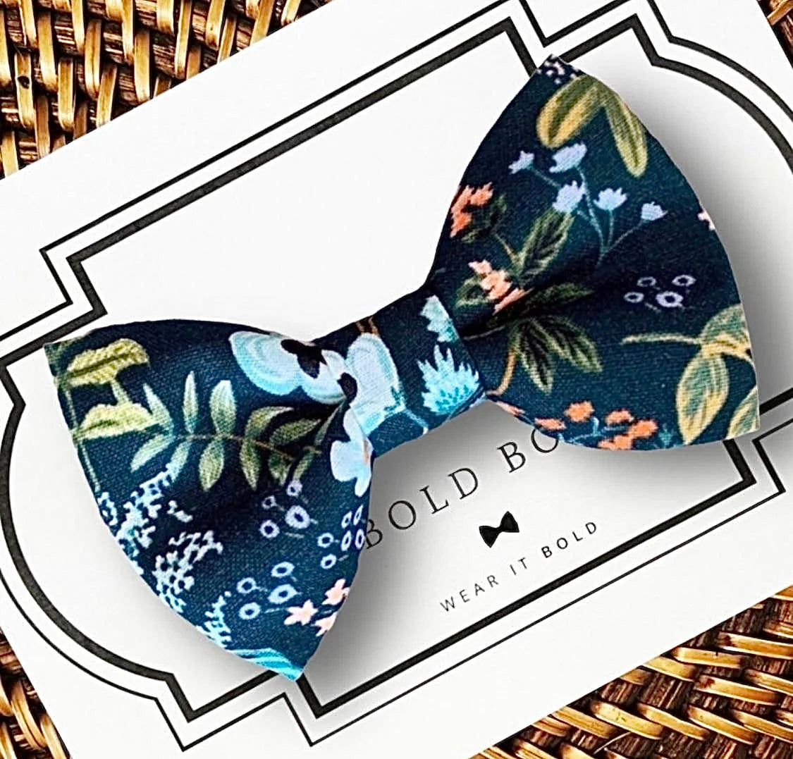 Elevate your pet's style with our premium Navy Bow Tie, handcrafted in the USA using iconic Rifle Paper Co floral fabric. Whether you are looking for a sophisticated Navy Dog Bow Tie or a charming Cat Bow Tie for a cat collar, our artisan accessories are designed to fit seamlessly onto any standard dog or cat collar. Each piece is hand-sewn by our woman-owned, family-run team with a focus on durability and classic American craftsmanship.