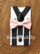 Your special guy will look so handsome when he shows up wearing this charming pink bow tie and dark gray suspenders! This set is a great choice for family photos, wedding, ring bearer outfit, birthday celebration or any other special occasion.