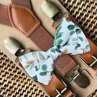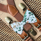 Sage & Gold Greenery Bow Tie & Cognac Buckle Suspenders Set
